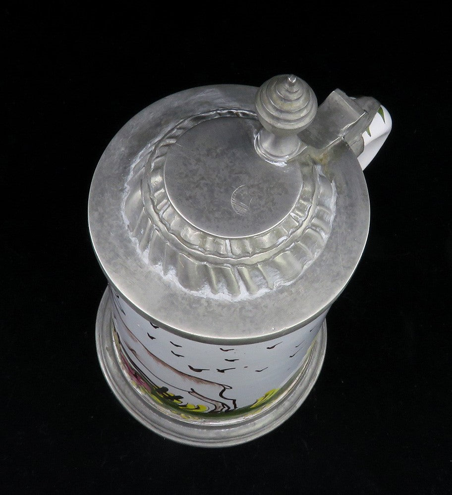 Presented is a charming antique German lidded beer stein, dating to the mid 1800s. This stein is white glazed faience pottery, with a colorful scene on the front of a stag leaping over a fence, with birds in the sky and yellow and pink flowers in the grass underfoot, all done in a charmingly stylized yet distinct style. The lid and foot rim are pewter. This stein has a capacity of a half a liter (500 milliliters/16.9 fluid ounces).