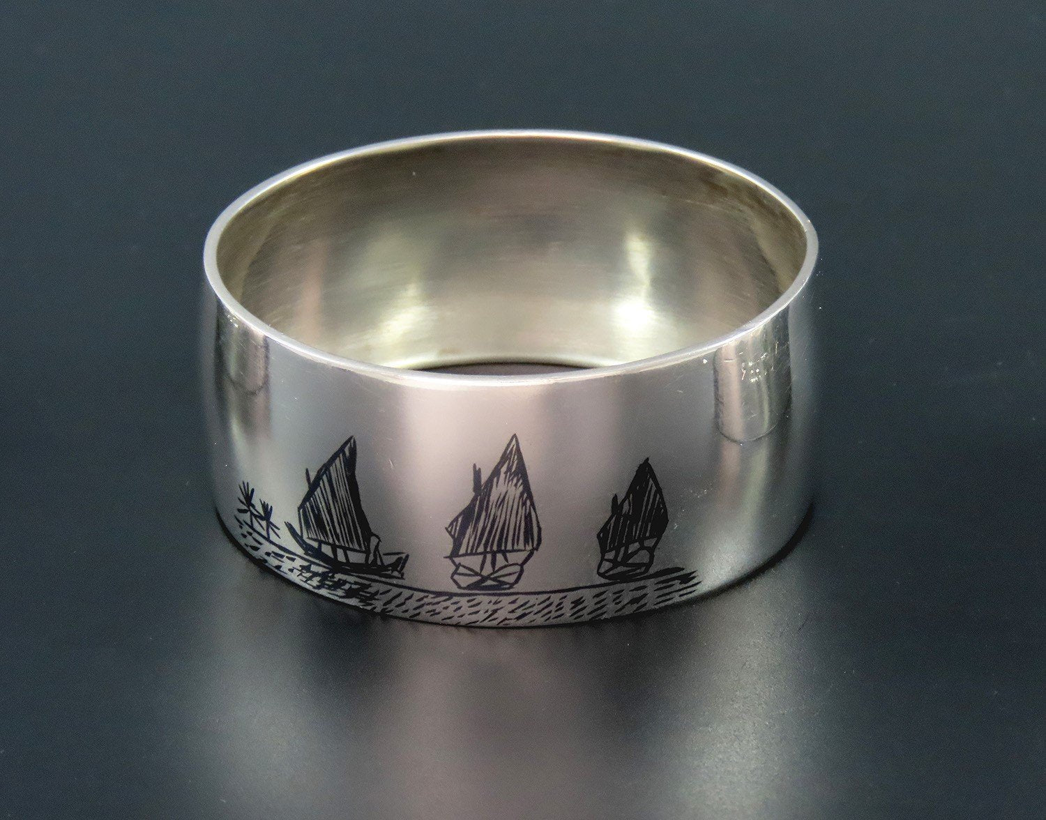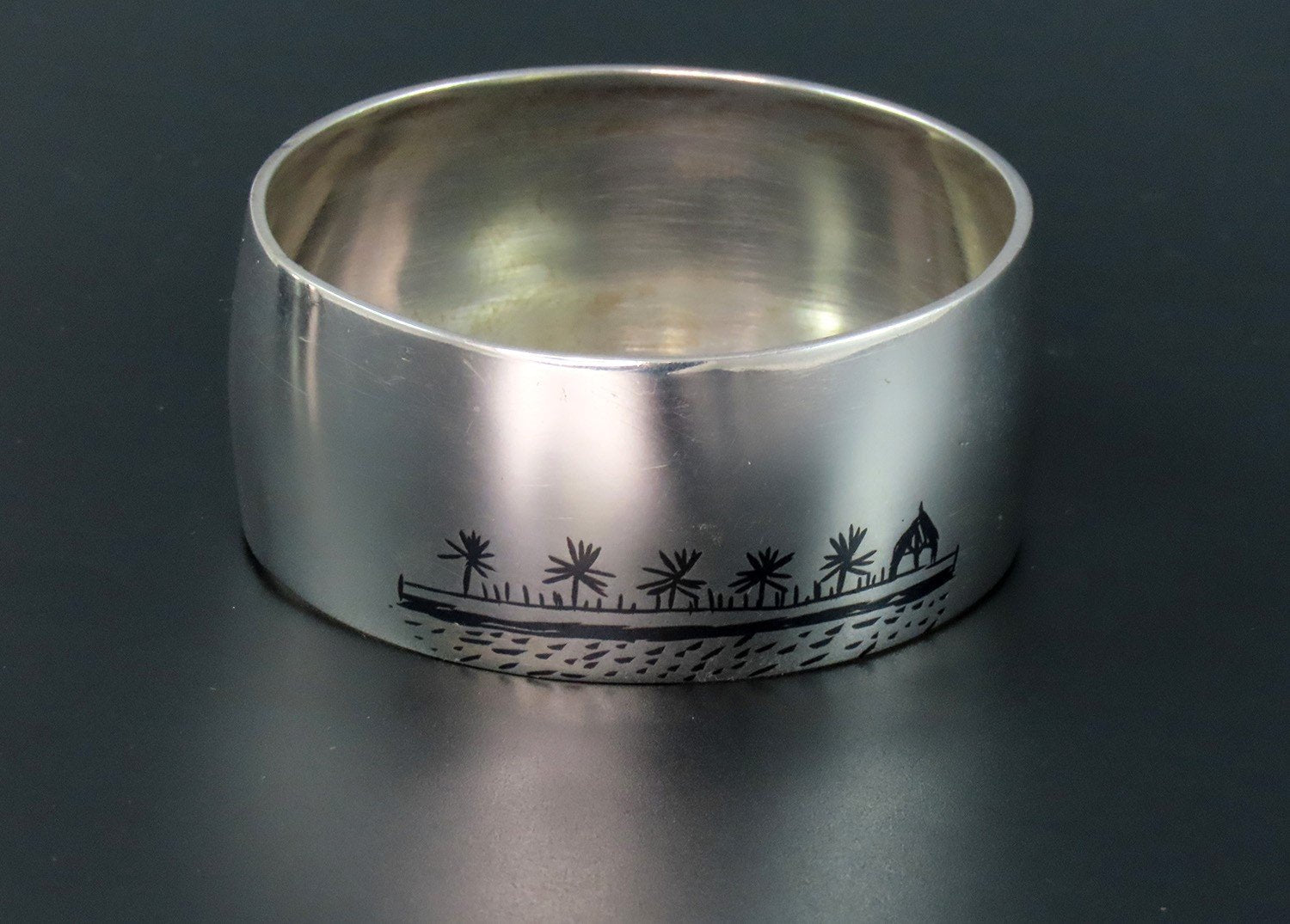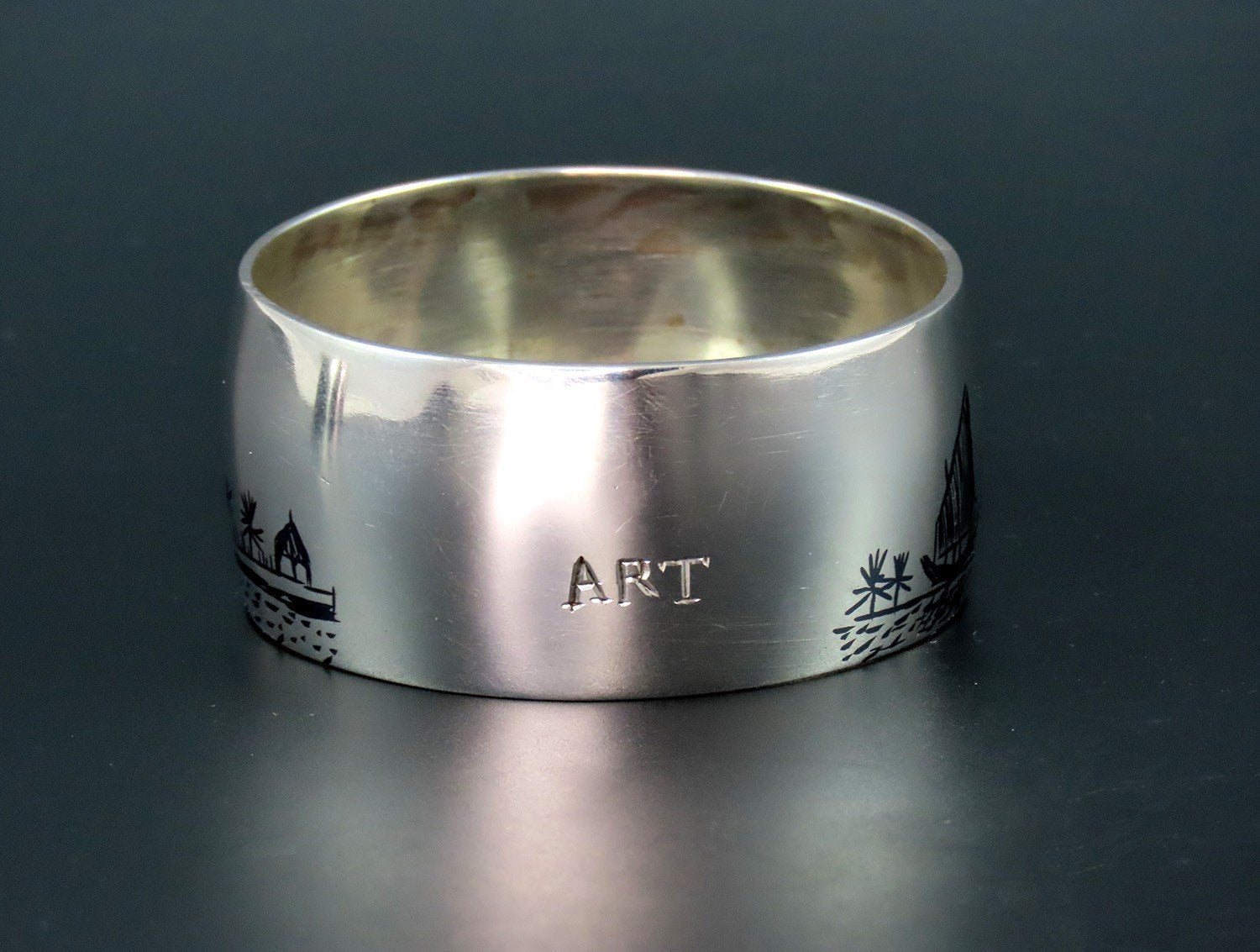 Presented is a nice Middle Eastern engraved silver napkin ring. This piece displays two enamel decorated scenes; one with three boats and the other with stylized palm trees. Between the scenes, the ring is engraved “Art”.