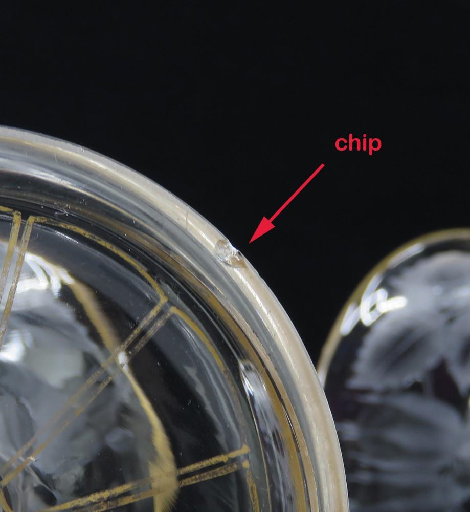 This pair of vases is in excellent overall condition. There is some minor wear to the gilding of the rims, but the gilding is overall intact. There is a tiny chip to the underside of the foot on one vase, as pointed out in the tenth photograph. Otherwise, There are no chips, no cracks, no breaks, and no repairs.