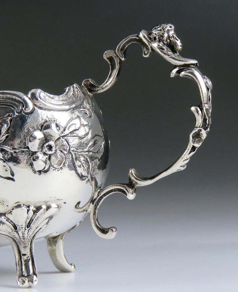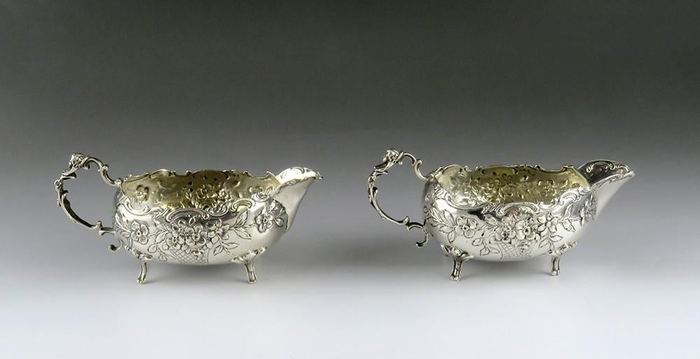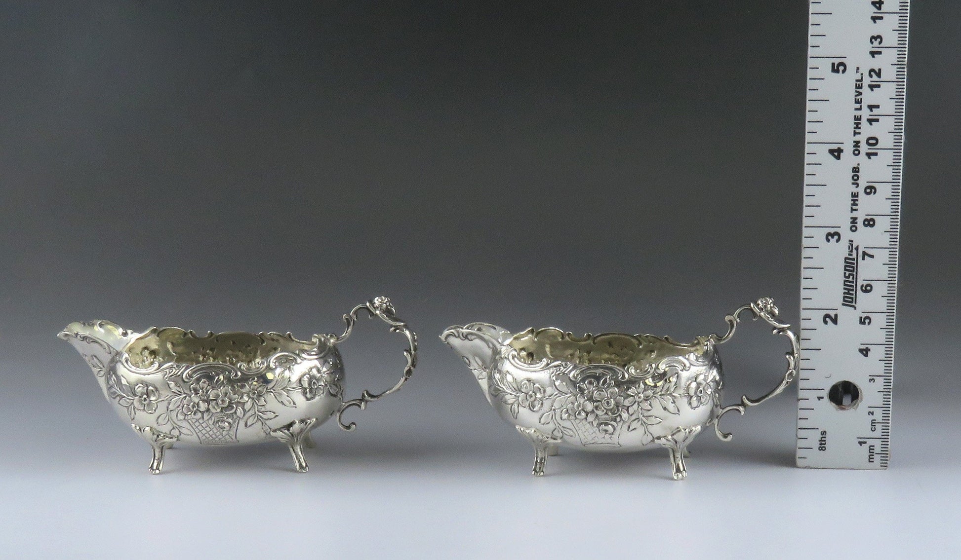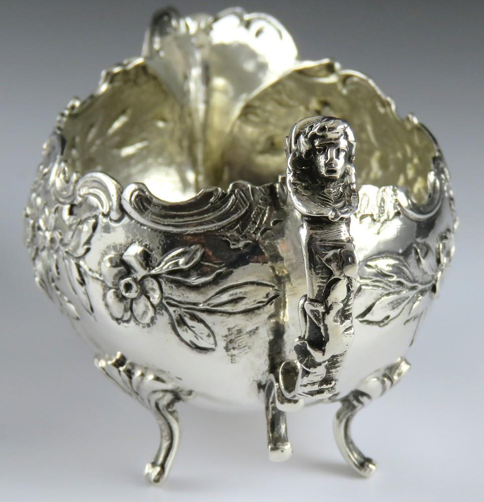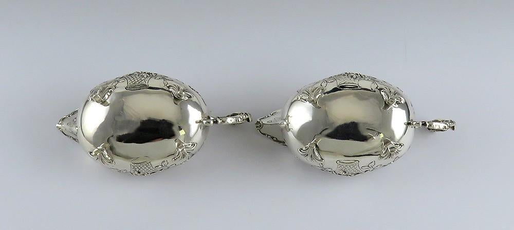 Presented is a lovely pair of antique Hanau German silver gravy or sauce boats, dating to the late 1800s. The gravy boats are made in a beautiful and ornate style, finely hand chased with a basket of flowers on both sides. The rims are decorated with an alternating C scroll border. The handle, separately cast and applied, is likewise in a scroll design with a little cherub or putti figurehead as the thumbpiece. The boats are a charming small size, not like a Thanksgiving gravy tureen, more in line with a large salt cellar, so perhaps intended for delicate French sauces, though of course you can use them however you like.