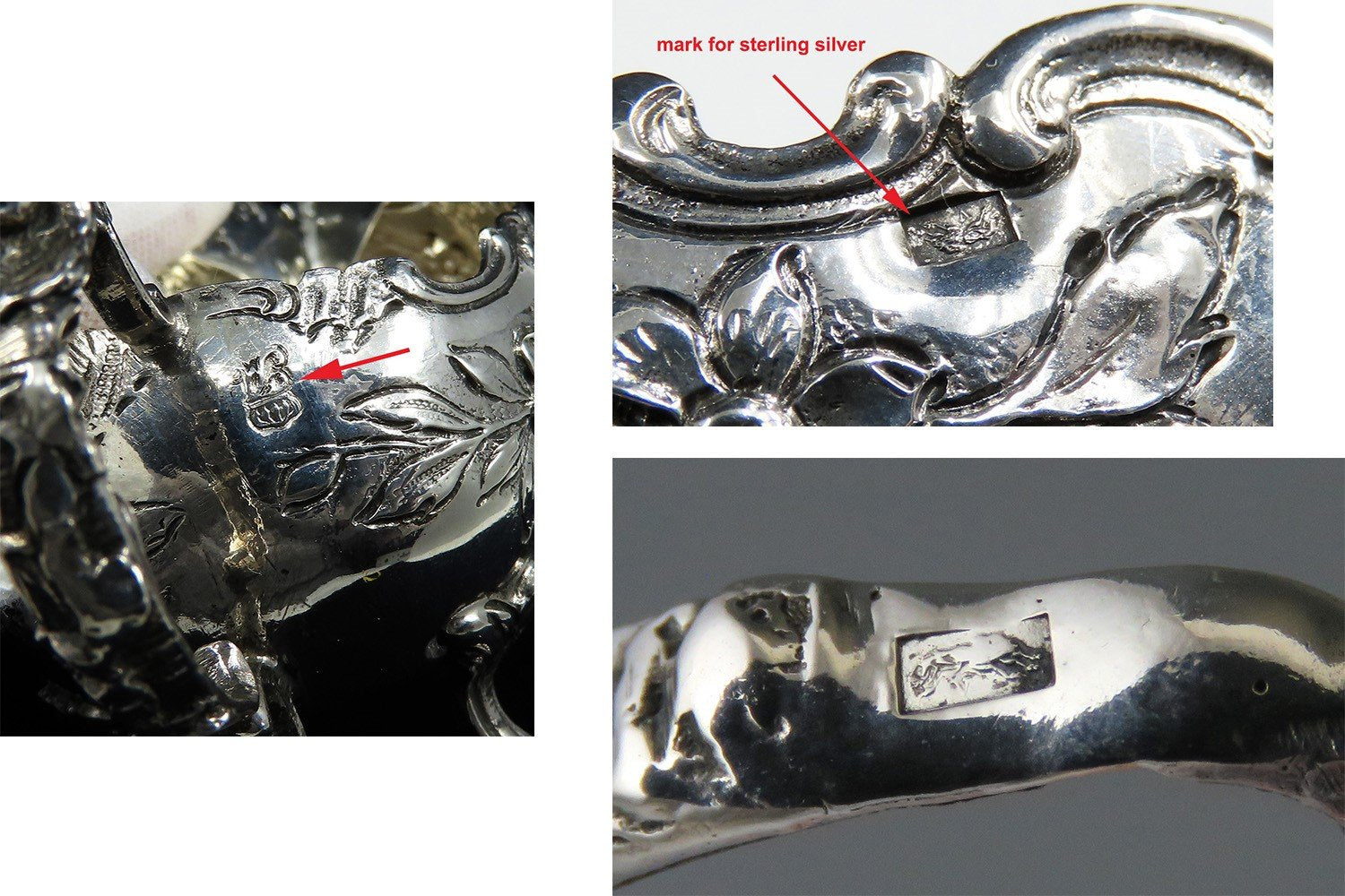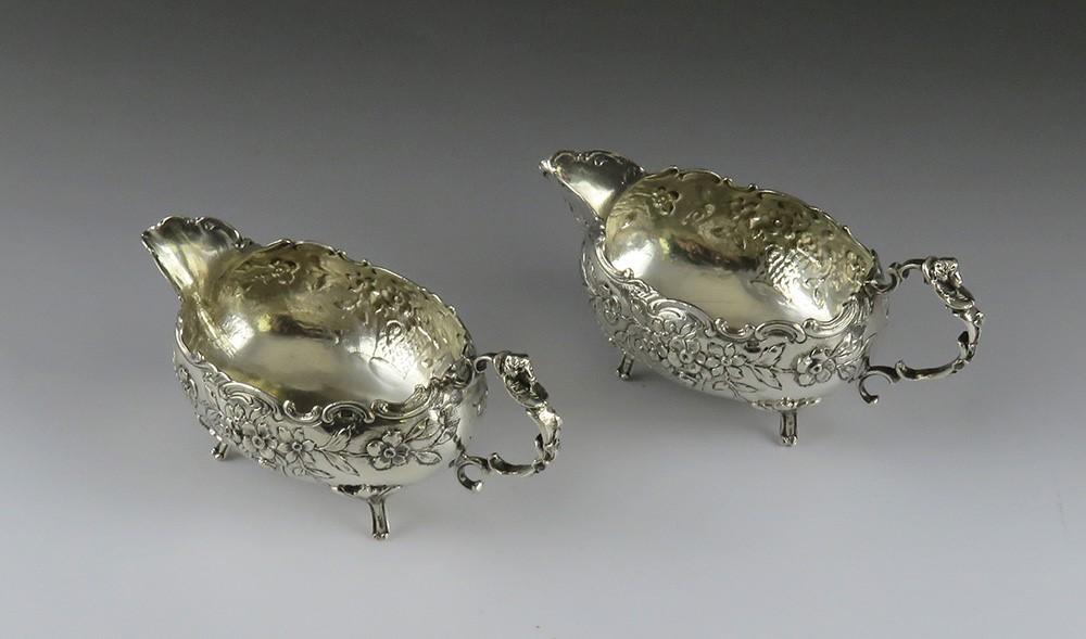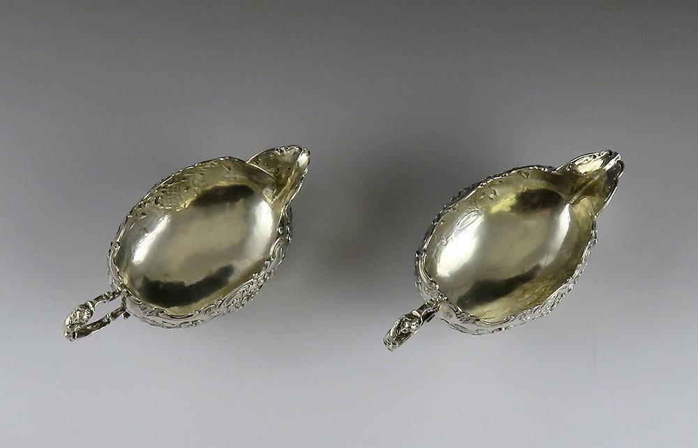 Both the gravy boats have a maker's mark beside the handle, an A with a crown above it, as well as a French import mark along the rim, a cricket or similar type insect in a rectangular punch. The gravy boats are silver of at least 900 purity, nitric acid tested and guaranteed.