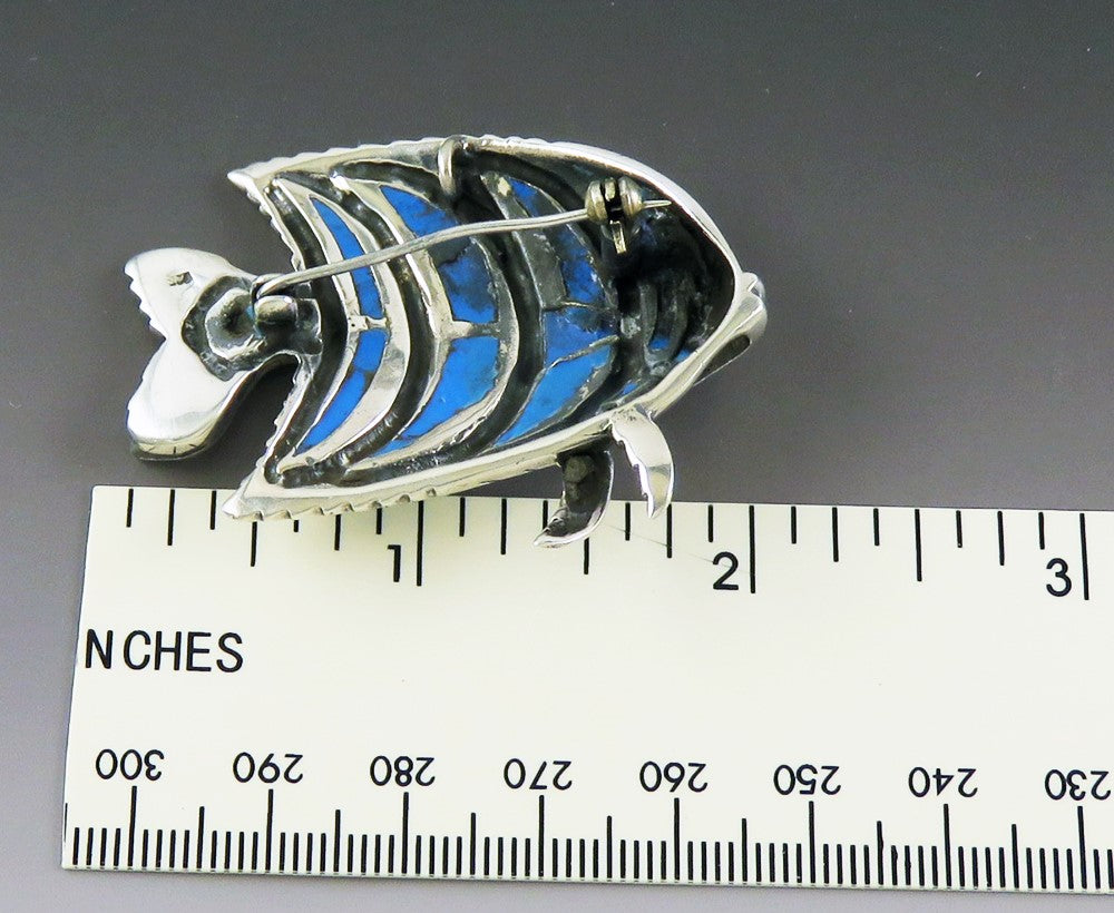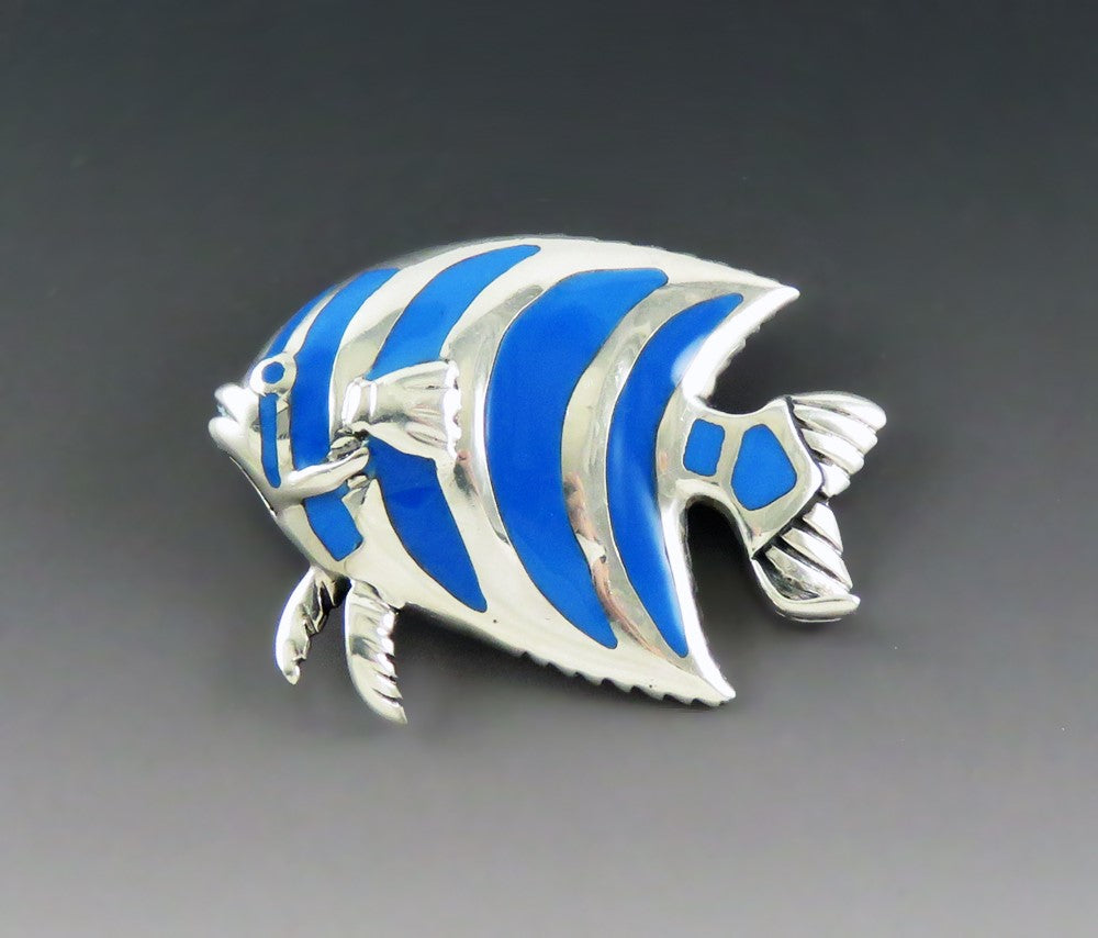 Presented is a nice vintage sterling silver pin or brooch in the shape of a angelfish or other tropical fish. The fish is well done, with a nice dynamic look, like the fins and tail are in motion. The vivid blue stripes of the fish are blue resin, and stand out nicely against the sterling silver. The pin has a rollover style safety clasp as well as a loop/bail so it could be put on a cord or chain.