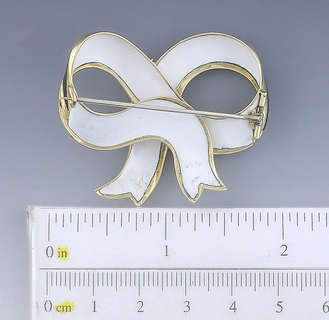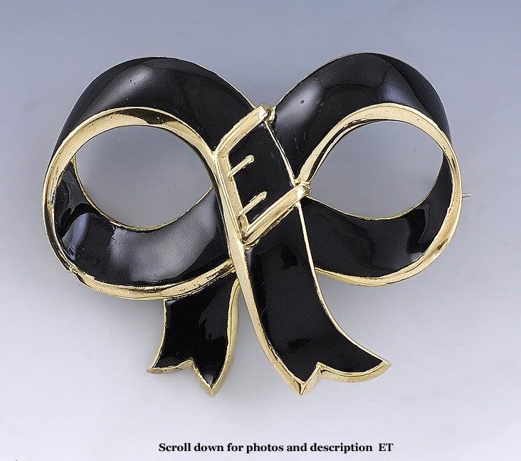Charming Victorian 18k Gold Black & White Enamel Ribbon Buckle Pin Brooch