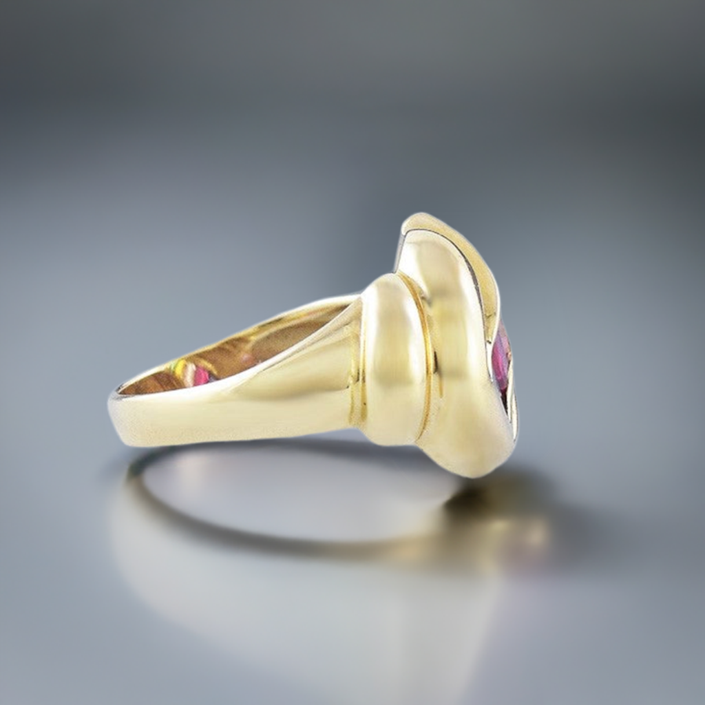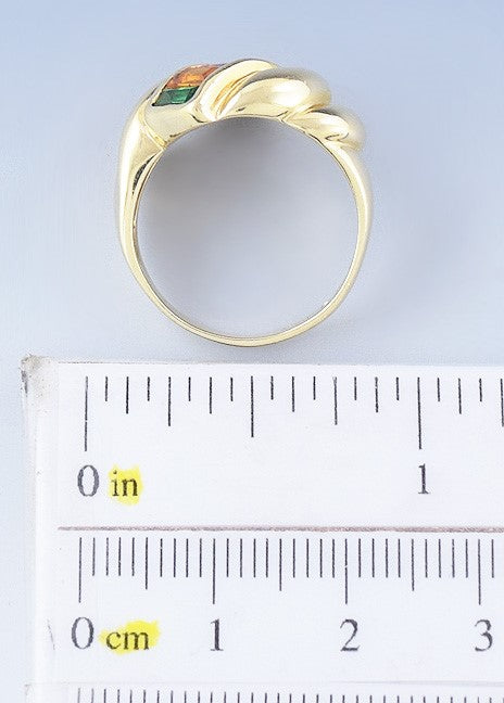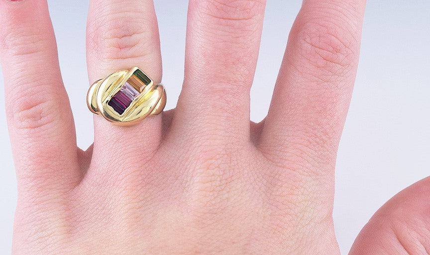 Presented is an eye-catching 14 karat gold, multi-gemstone ring. This is a modern piece, made in Italy. The ring is channel set with five rectangular emerald cut stones, each one different. The stones are probably amethyst, synthetic ruby, morganite or another light pink gemstone, citrine, and green tourmaline. We aren't sure of these identifications, because our gemologist was unable to get a reading due to the nature of the setting. The gold setting is done in a swirl design. This is a colorful, fun piece, very flattering on the hand.