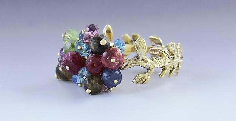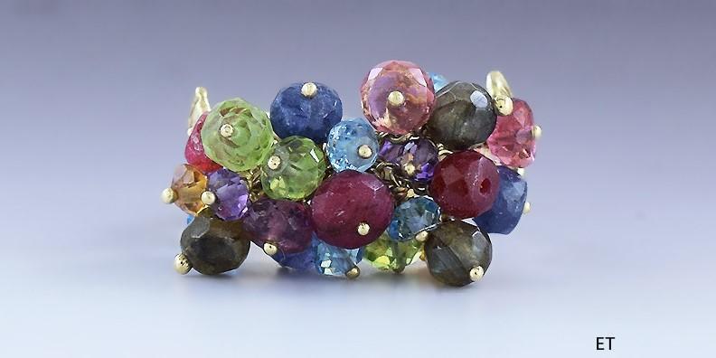 with a variety of faceted gemstone beads on gold wire. The beads are ruby,