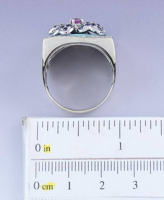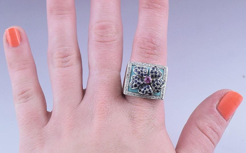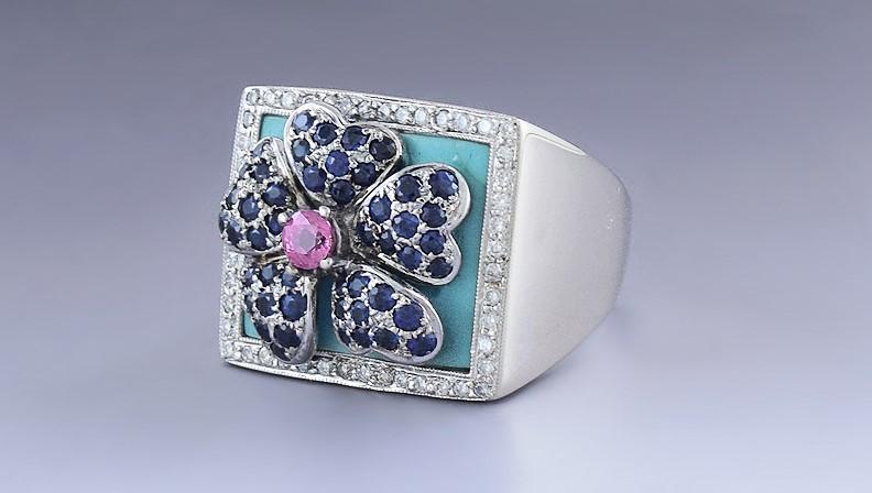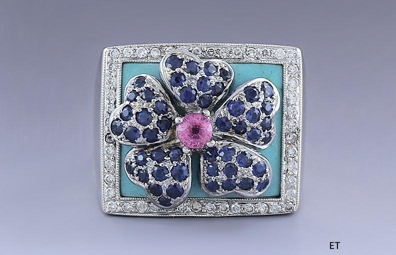 sapphires, diamonds, and turquoise. This is a modern ring of European make,