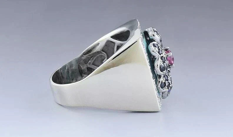 Stunning 18k White Gold Turquoise Blue & Pink Sapphire Diamond Flower Ring
