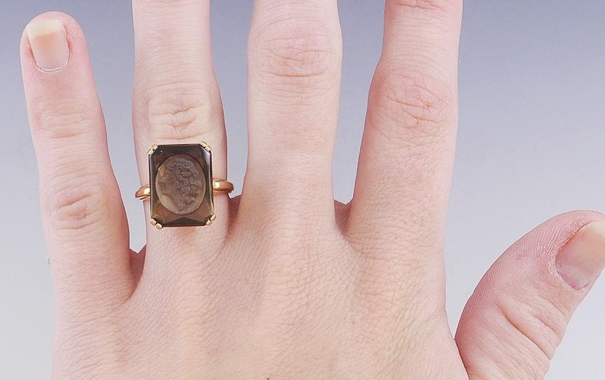 Presented is a fine 14 karat gold and carved smoky quartz ring. This ring was made by Church & Company, an American company specializing in signet rings. The ring is set with a rectangular cut smoky quartz of about 8.27 carats in size. This stone has been laser carved with a cameo style depiction of a pretty woman in profile, very detailed and well done.