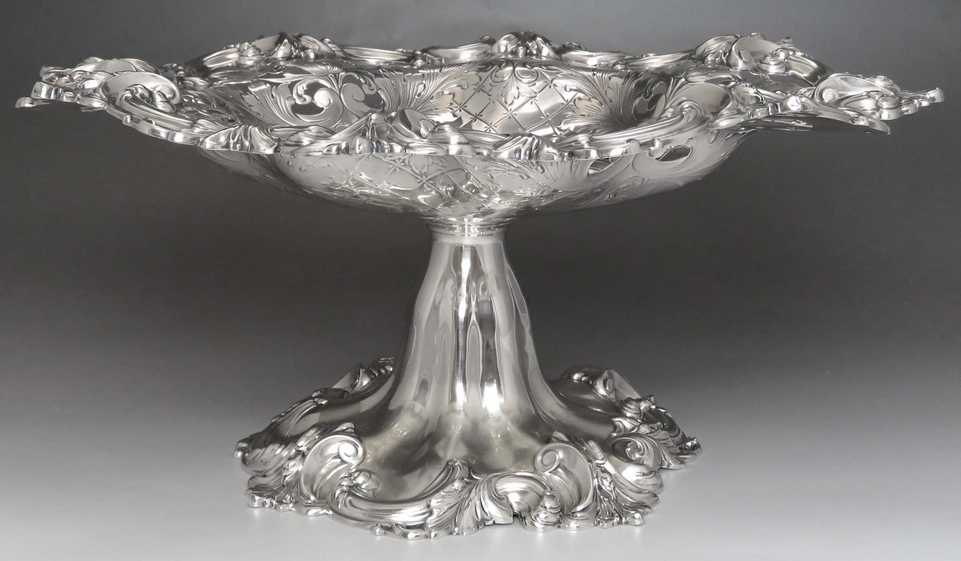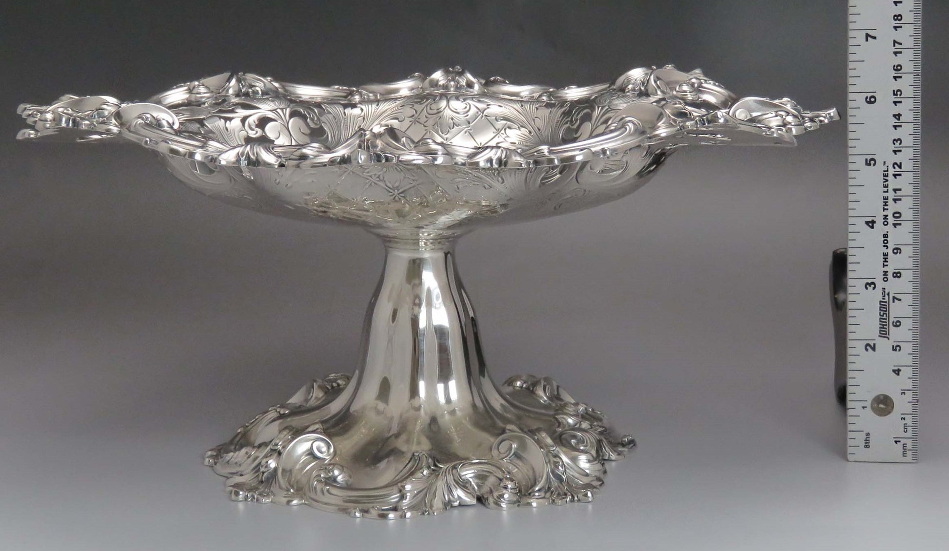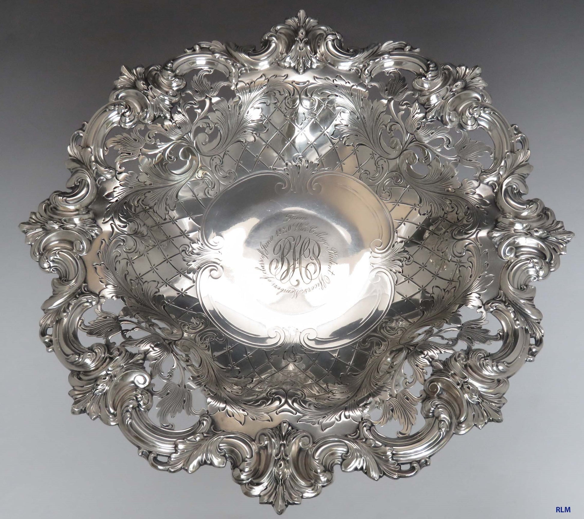 Presented is a nice vintage American sterling silver compote or serving dish. This piece has beautiful hand chased lattice and leaves throughout. In the center of the dish there is monogram “BHP” with writing around it; “From War College, (The US Army War College in Carlisle, PA) Student Officers, Members of Class June 1920”. There is gorgeous open pierced work throughout the edge of the dish on the top and bottom. The dish has a lovely raised border. The dish is great quality and well made. Let the photos be your guide. This piece was made circa 1920.