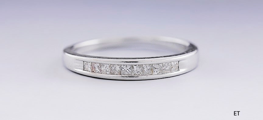 Presented is a classy 14 karat white gold and diamond ring. This is a modern ring, likely of American make. The ring is channel set with 10 modern brilliant cut diamonds, of about 2.5 points each in size. The diamonds are vibrant, dazzling stones of VS-2 to SI-1 clarity and H/I/J color. The ring is done in a classic anniversary band design.
