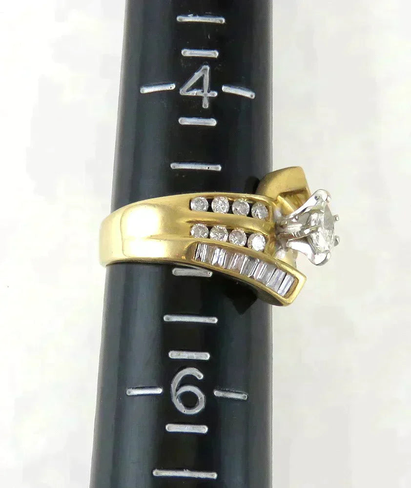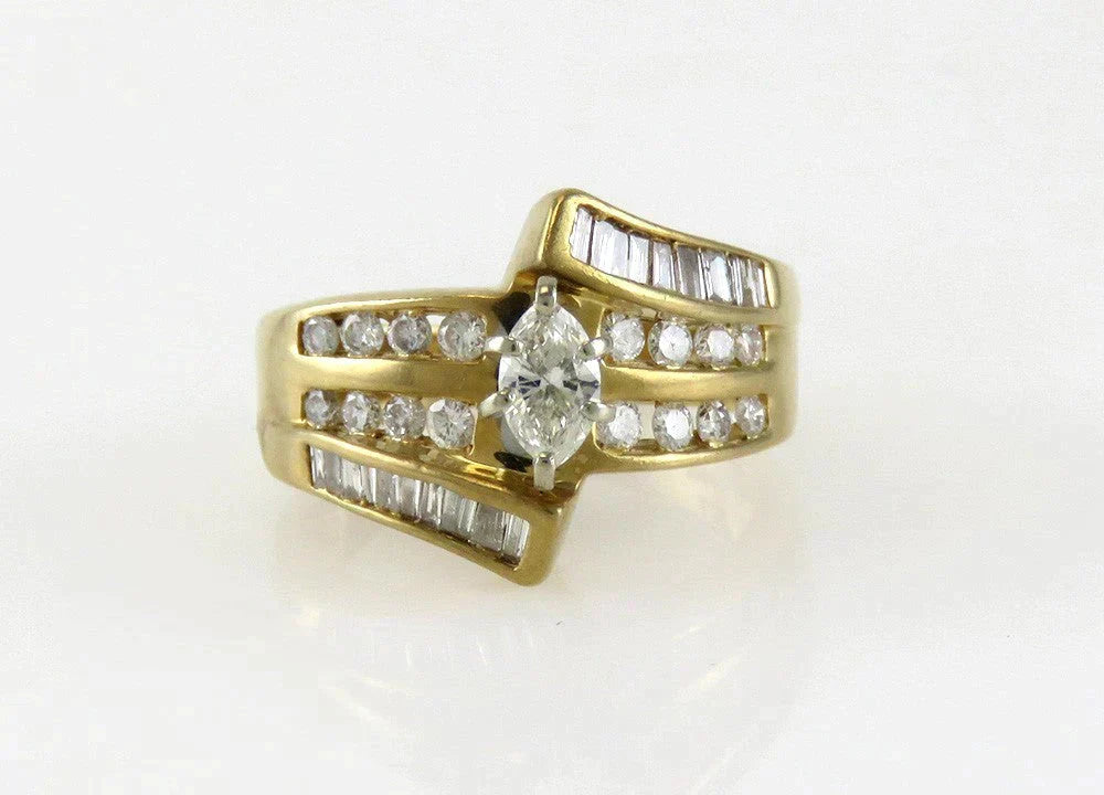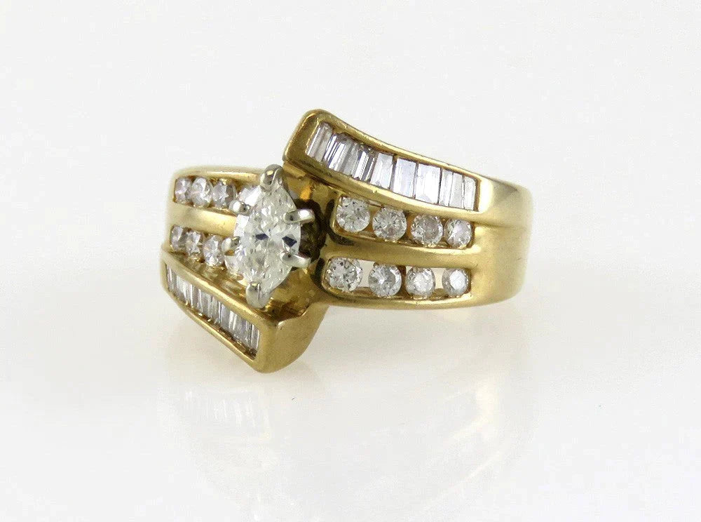 Presented is a stunning 14 karat yellow gold and diamond ring. This is a relatively contemporary piece, likely of American make. The ring is prong set with a marquise cut diamond, of about 20-25 points in size. On either side, forming almost a bypass design, are rows of channel set modern brilliant cut and baguette diamonds. There are 16 modern brilliant cut diamonds of 2-3 points each in size, and 20 baguettes of about 1 point in size, for a total diamond weight in the ring of at least 75 points in weight (3/4 of a carat) and likely closer to a 90 points (.9ct). The diamonds are vibrant, dazzling stones of SI-1 to I-1 clarity and G/H color.