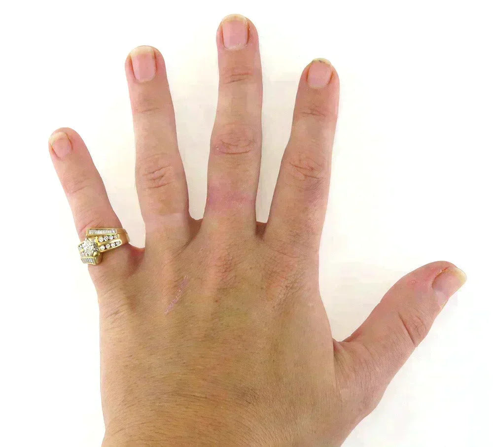 The ring is a size 5. The head of the ring measures about 13.7 millimeters north to south, while the band measures about 3.3 millimeters wide at the narrowest point.