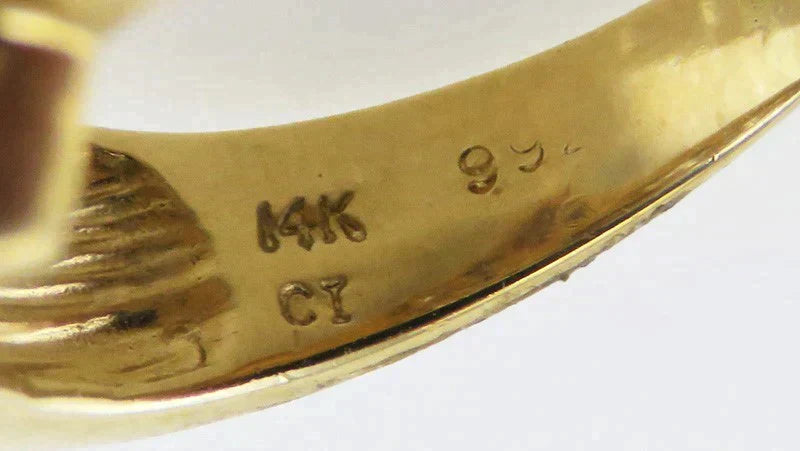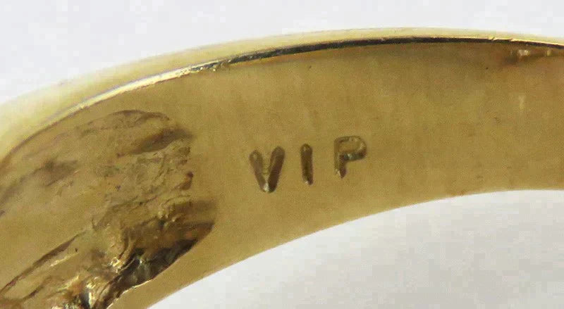 The ring is stamped and guaranteed 14k, as well as a maker's mark or other mark of VIP, CC, and what looks like 992.