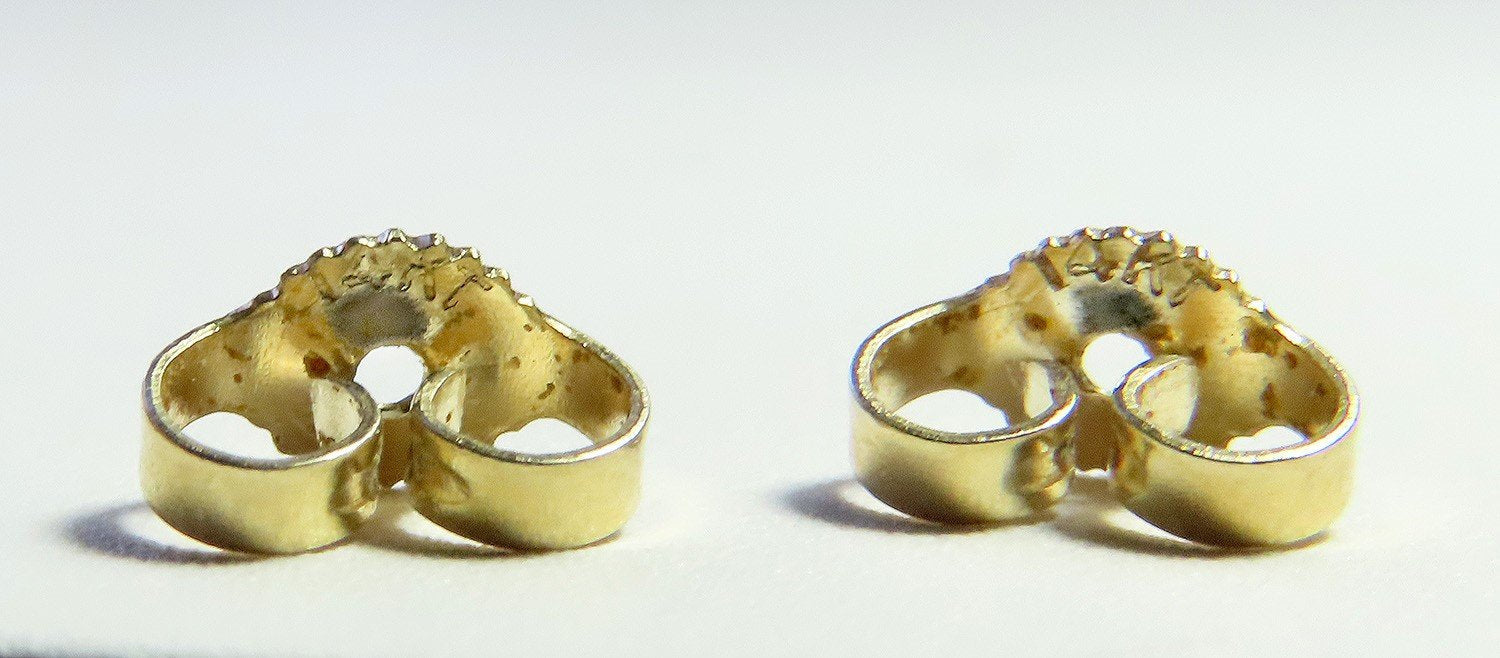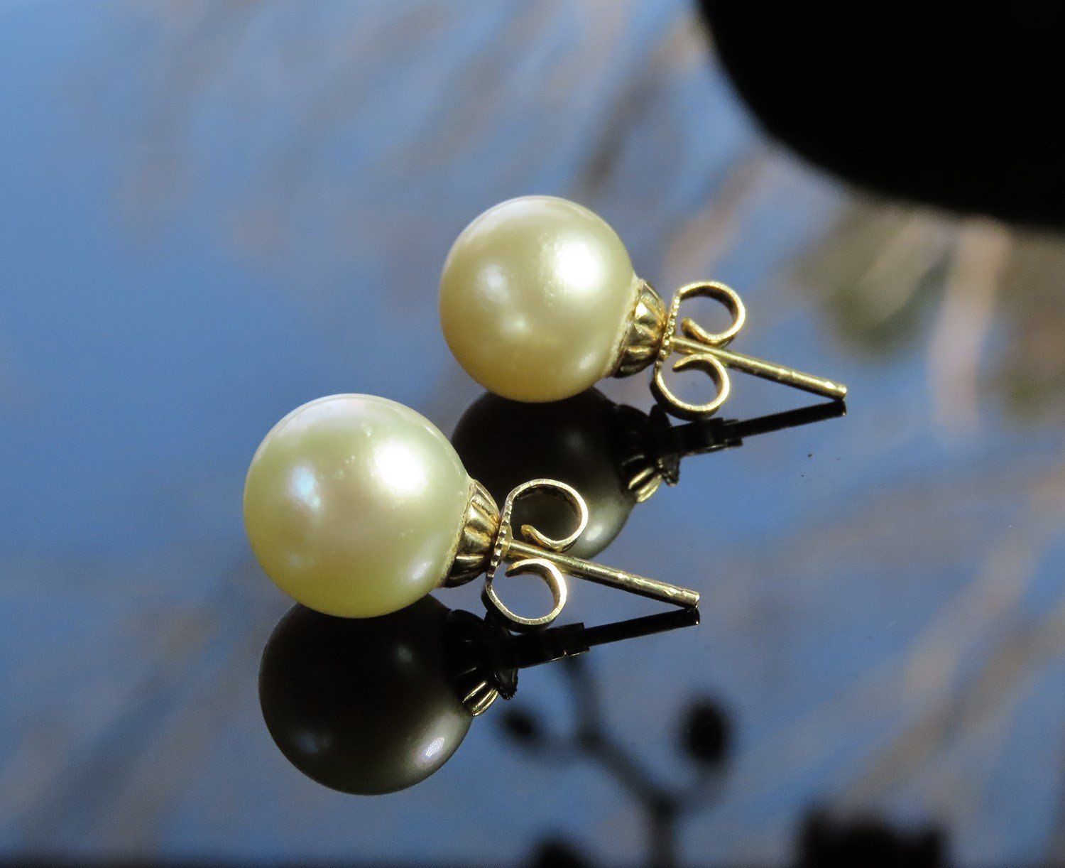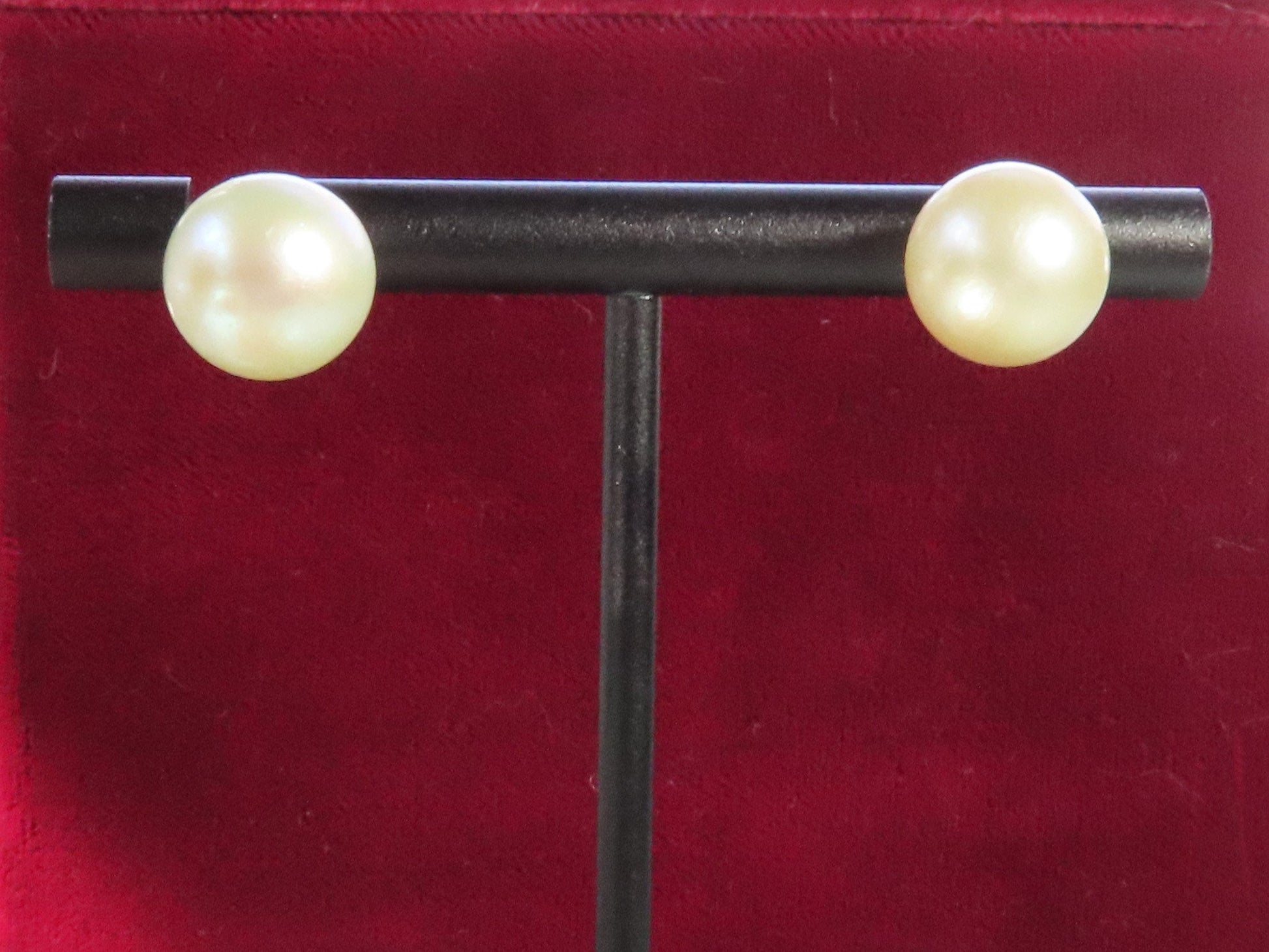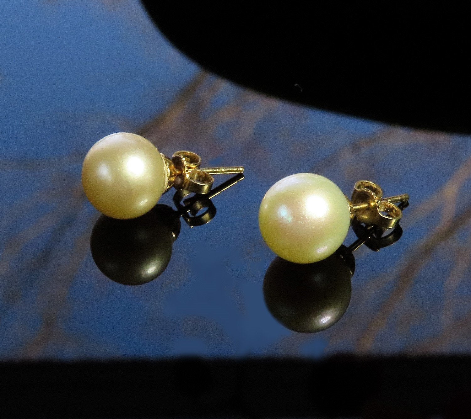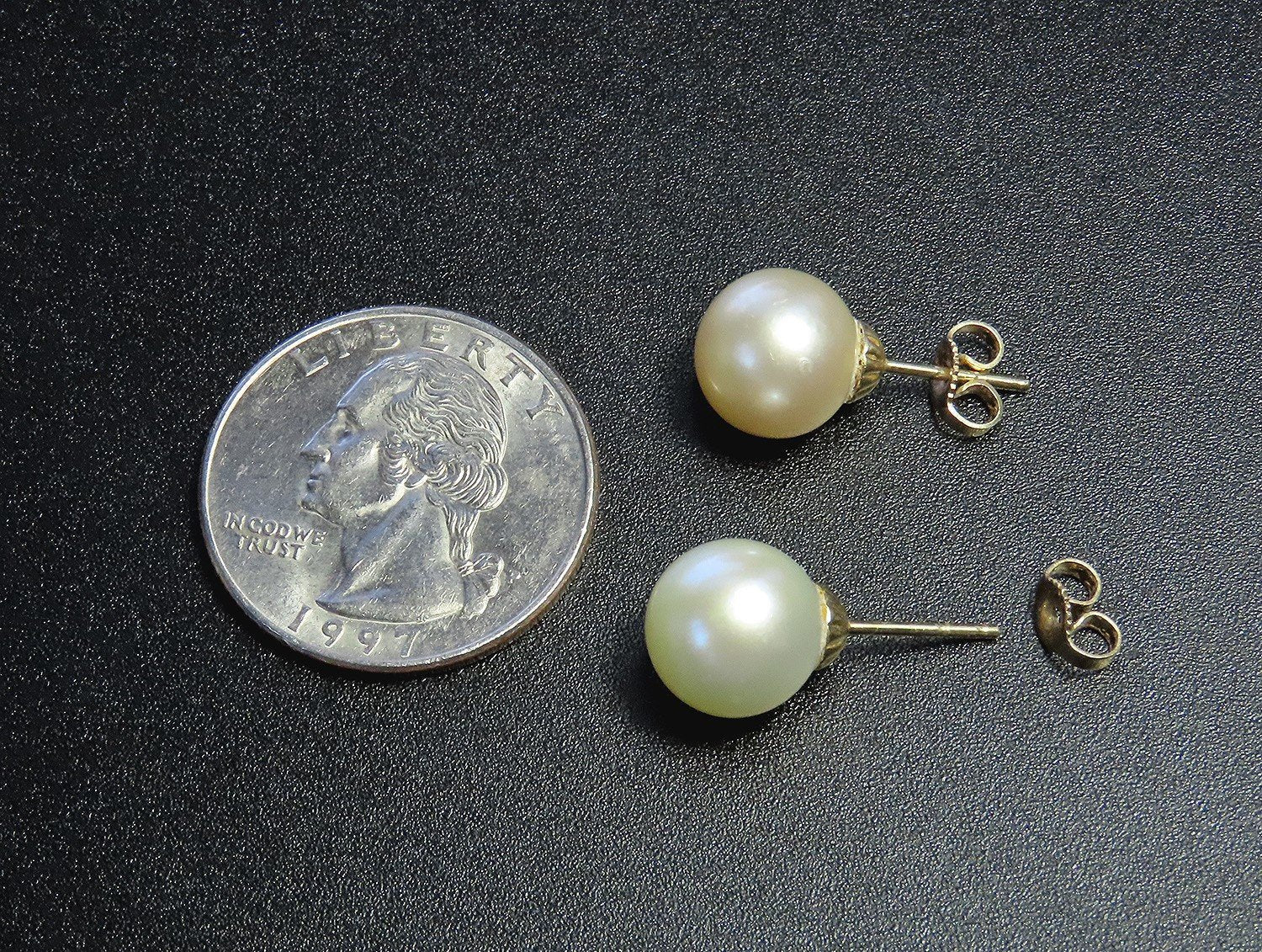 Presented is a classy pair of pearl stud earrings, with 14 karat yellow gold posts and backs. Each earring is securely set with a beautiful pearl of about 10 millimeters in diameter. The pearls are more in the cream range than bright white, with lovely pink and gold highlights. These earrings have posts with butterfly style backs, suitable for wear with pierced ears. A timeless look, and a must have for any jewelry collection. These earring butterfly backs are stamped and guaranteed 14k. The posts/mounts are also 14 karat gold, nitric acid tested and guaranteed.