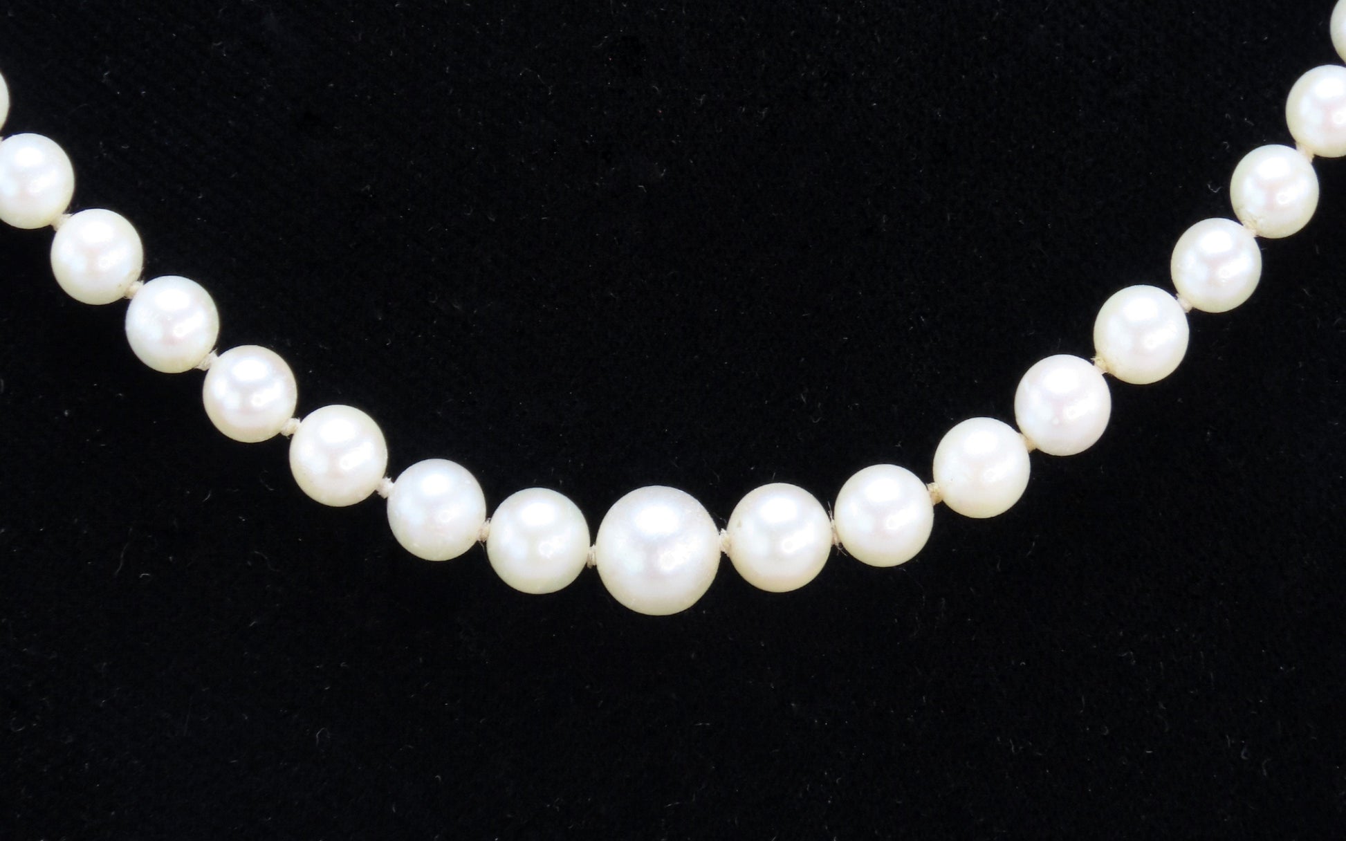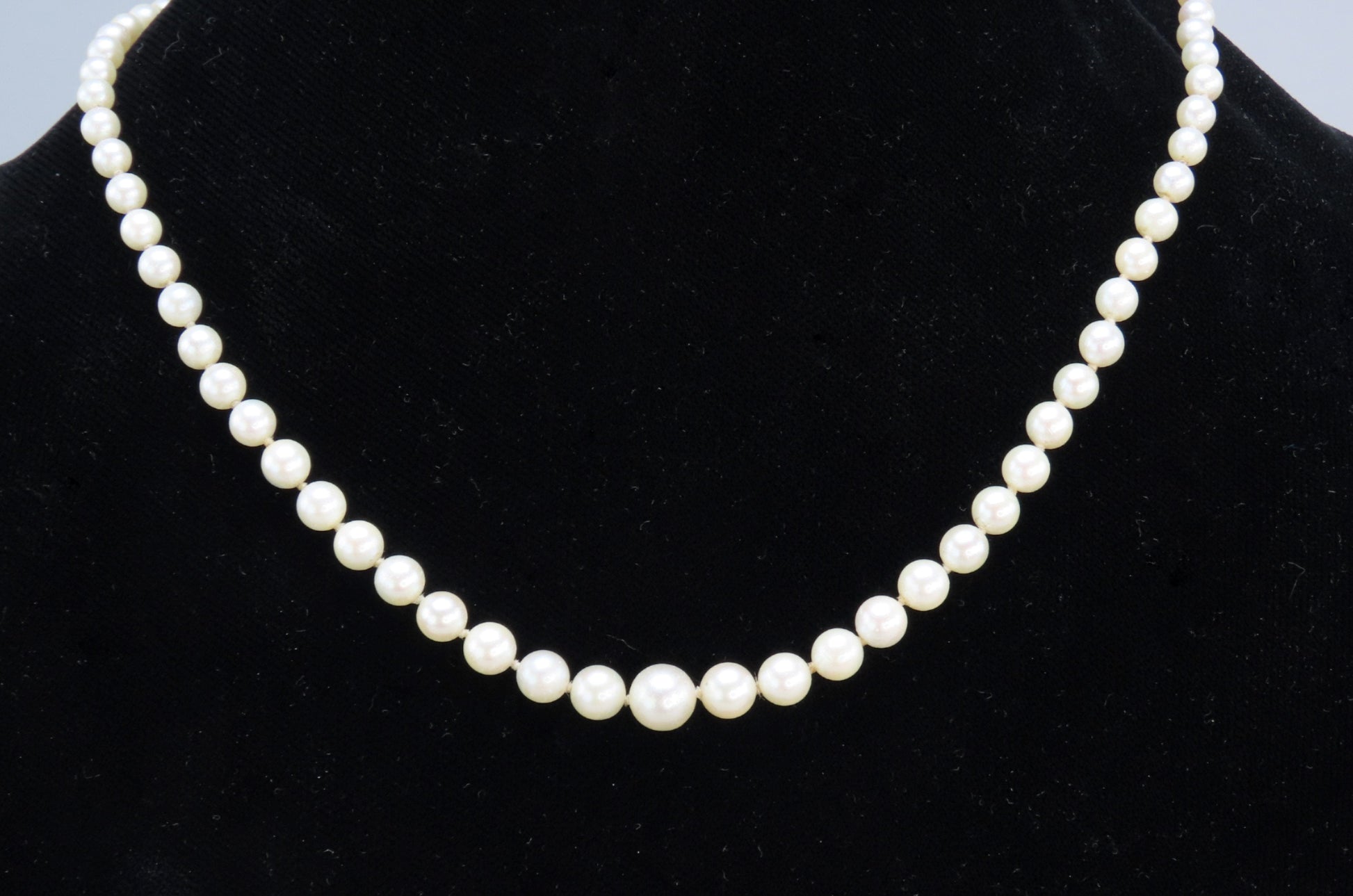 Presented is a classy single strand pearl necklace, with sterling silver clasp. The pearls are graduated in size from about 7.2 millimeters in diameter for the largest center pearl to about 3.7 millimeters for the smallest on either end of the strand. The pearls are well matched in color, with nice lustre and orient, and are individually knotted. The clasp is a hook/plunge style, done in beautiful silver filigree with an accent pearl.