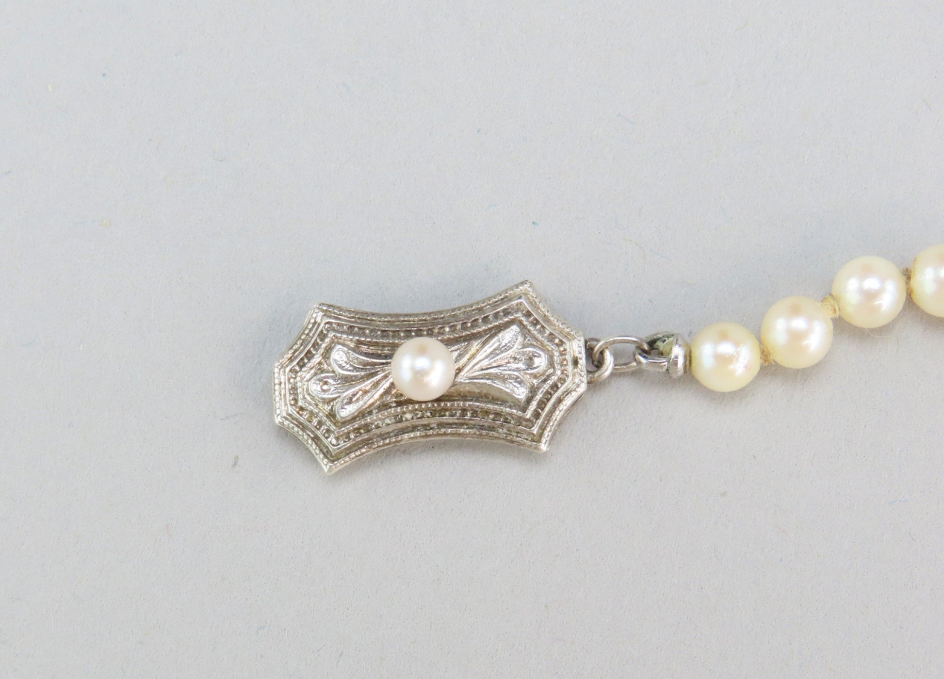This necklace is in excellent condition. The pearls are clean and in great shape. The clasp works well and closes securely.