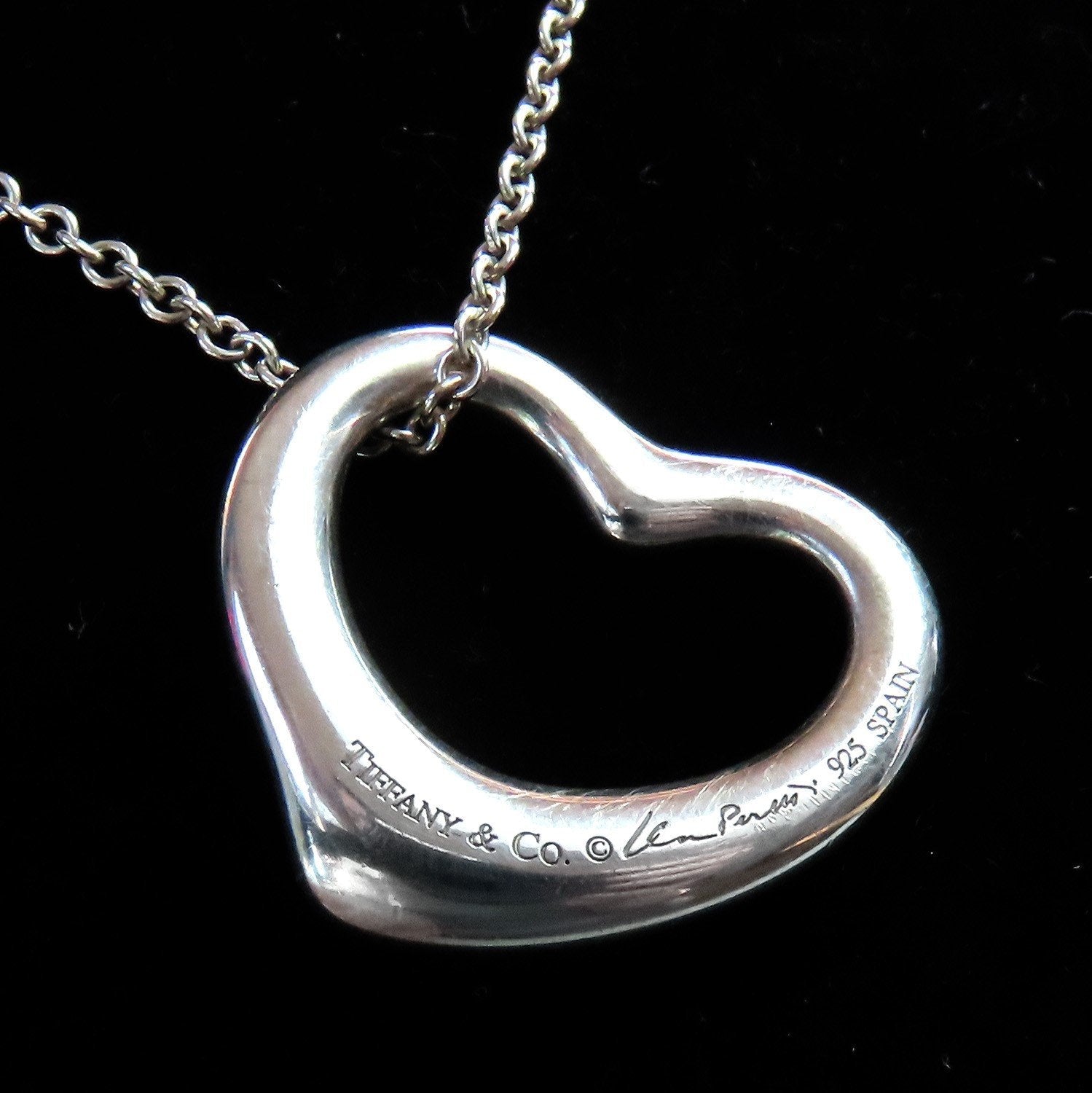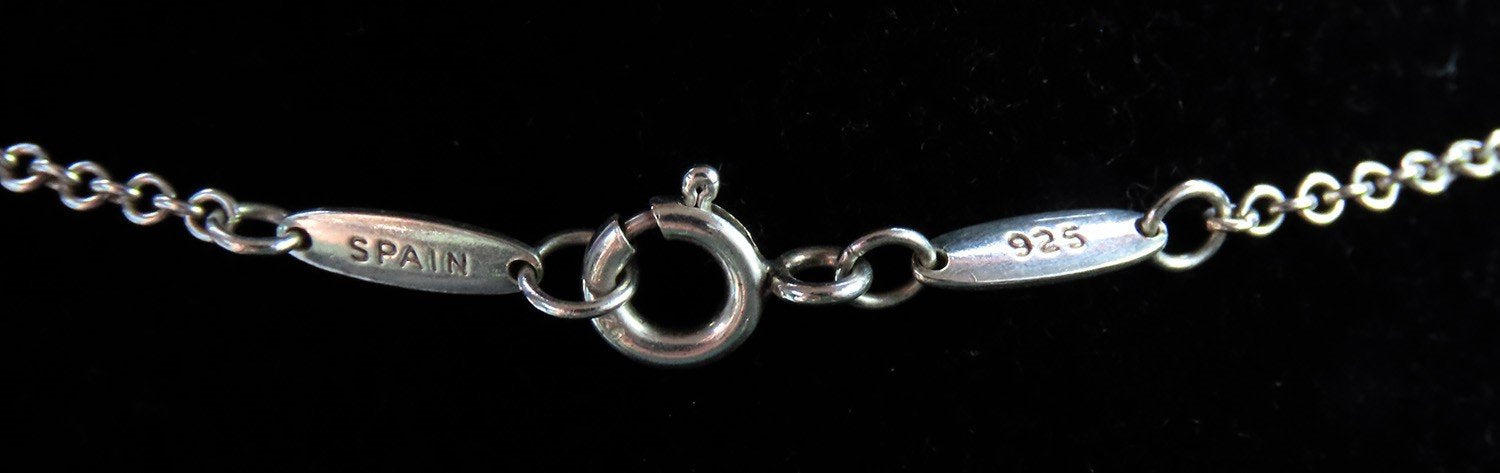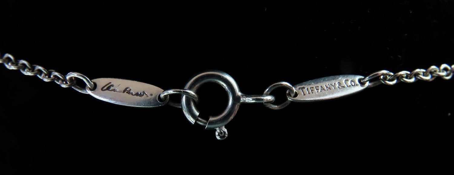 The pendant is stamped and guaranteed 925 for sterling silver, as well as Tiffany & Co, Elsa Peretti's signature, and Spain. The chain is likewise stamped on the long links on either side of the clasp, with 925, Tiffany & Co, Elsa Peretti's signature, and Spain.