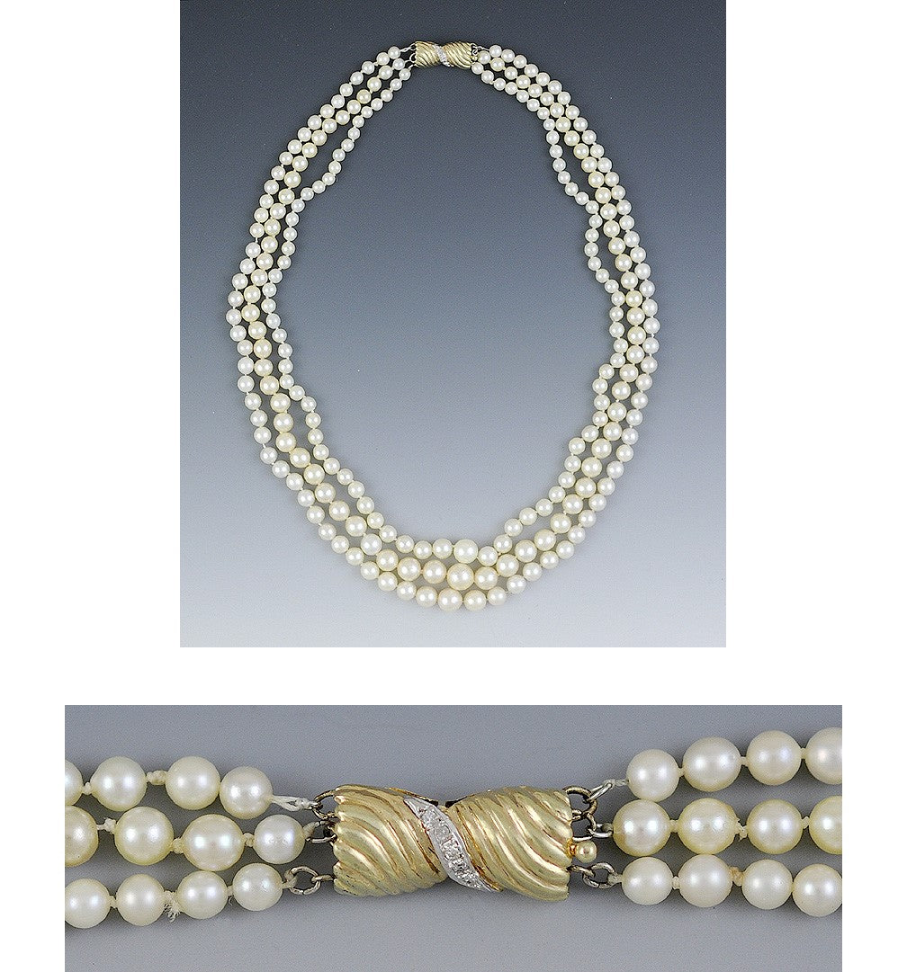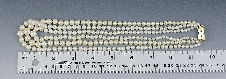 Classic Triple Strand Graduated Pearl Necklace 4.5-9.5mm 14K Gold Diamond Clasp