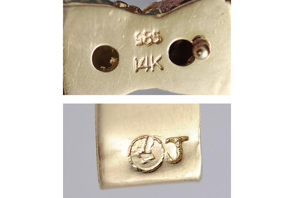The clasp is stamped 14k and 585, for 14 karat gold purity. The insert of the clasp is stamped with a maker's mark.