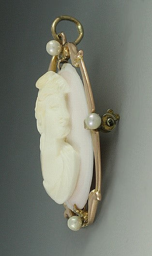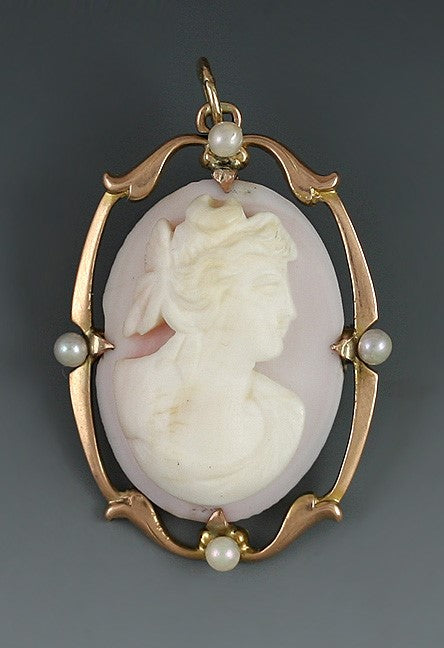 Presented is a nice carved shell cameo in a 10K gold and pearl-studded frame.