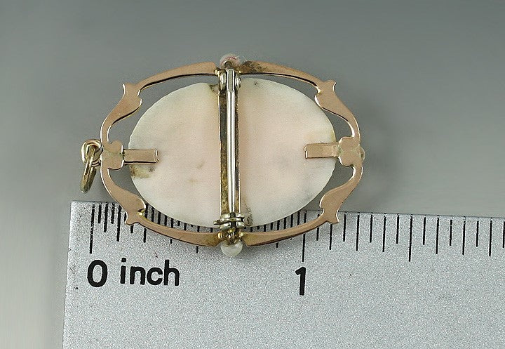 Classical Carved Shell Cameo 10k Gold Pearl Pin/Pendant of Goddess Diana