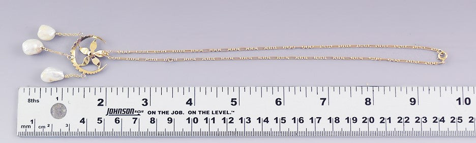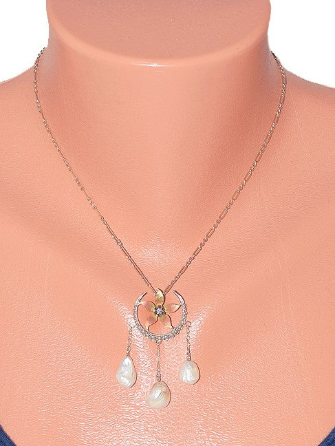 Classy 10k Gold Diamond & Pearl Art Nouveau Lavaliere Crescent Flower Necklace