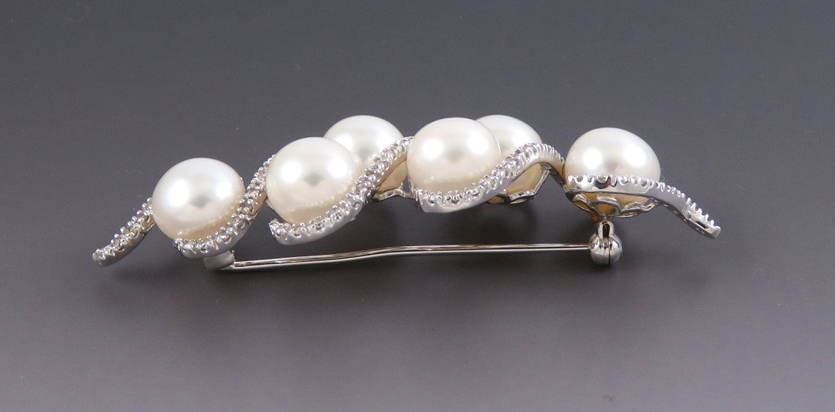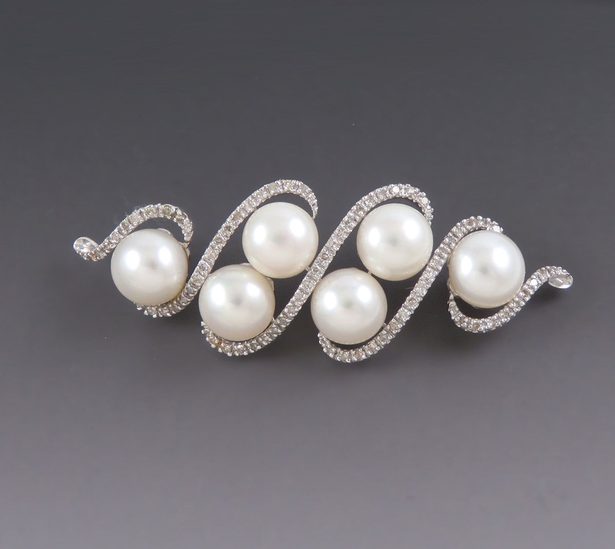 Presented is a fabulous 18 karat white gold, diamond and pearl pin or brooch. The pin is made in an elegant serpentine form, with diamond studded white gold swirling between pearls. There are 74 prong set diamonds, about half a point to three quarters of a point in size, totaling about half a carat in diamond weight. The six pearls are about 8.5-9 millimeters in diameter, with the the ones to the larger end of that range being at either end of the pin. The pin has a rollover style safety clasp.