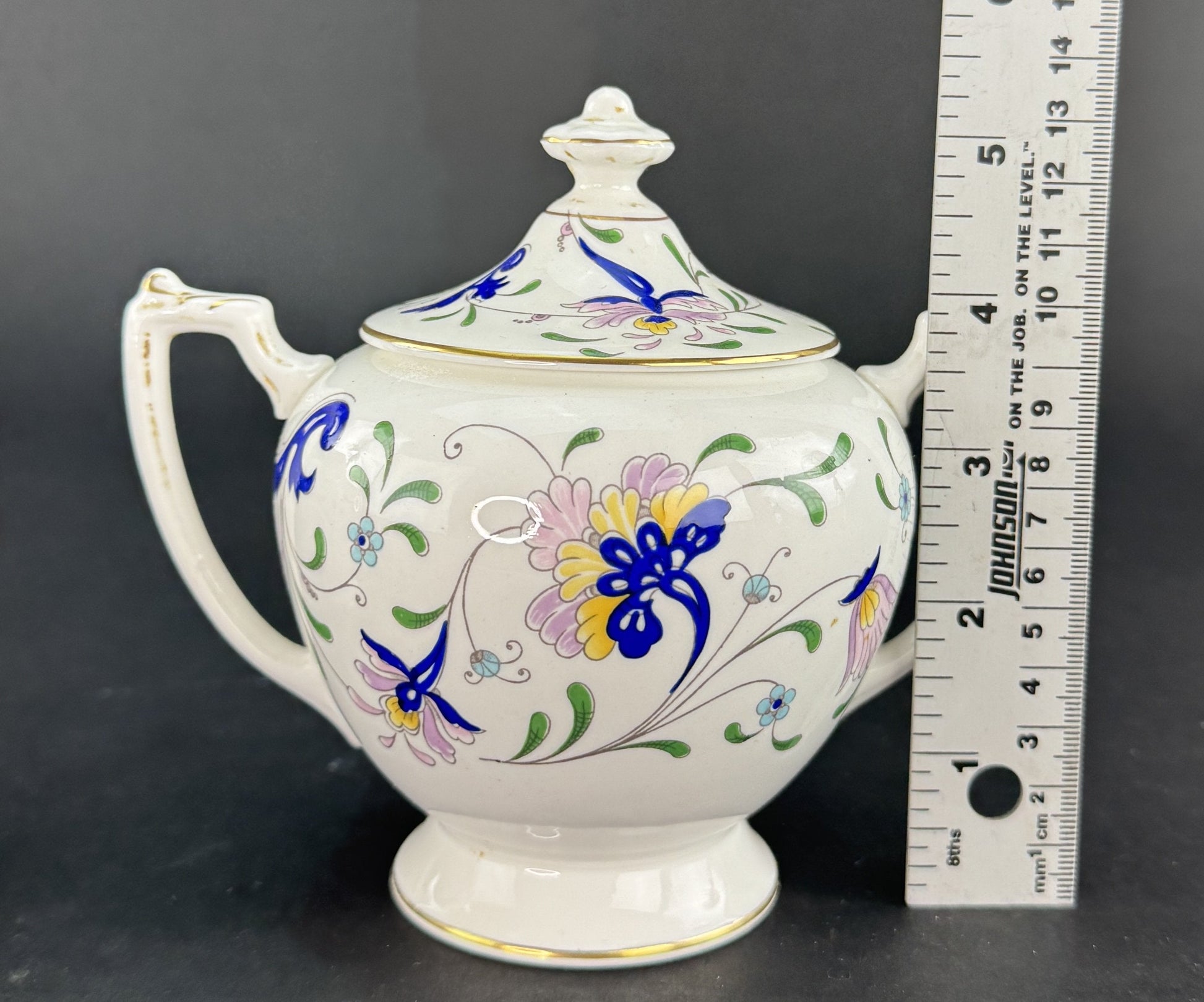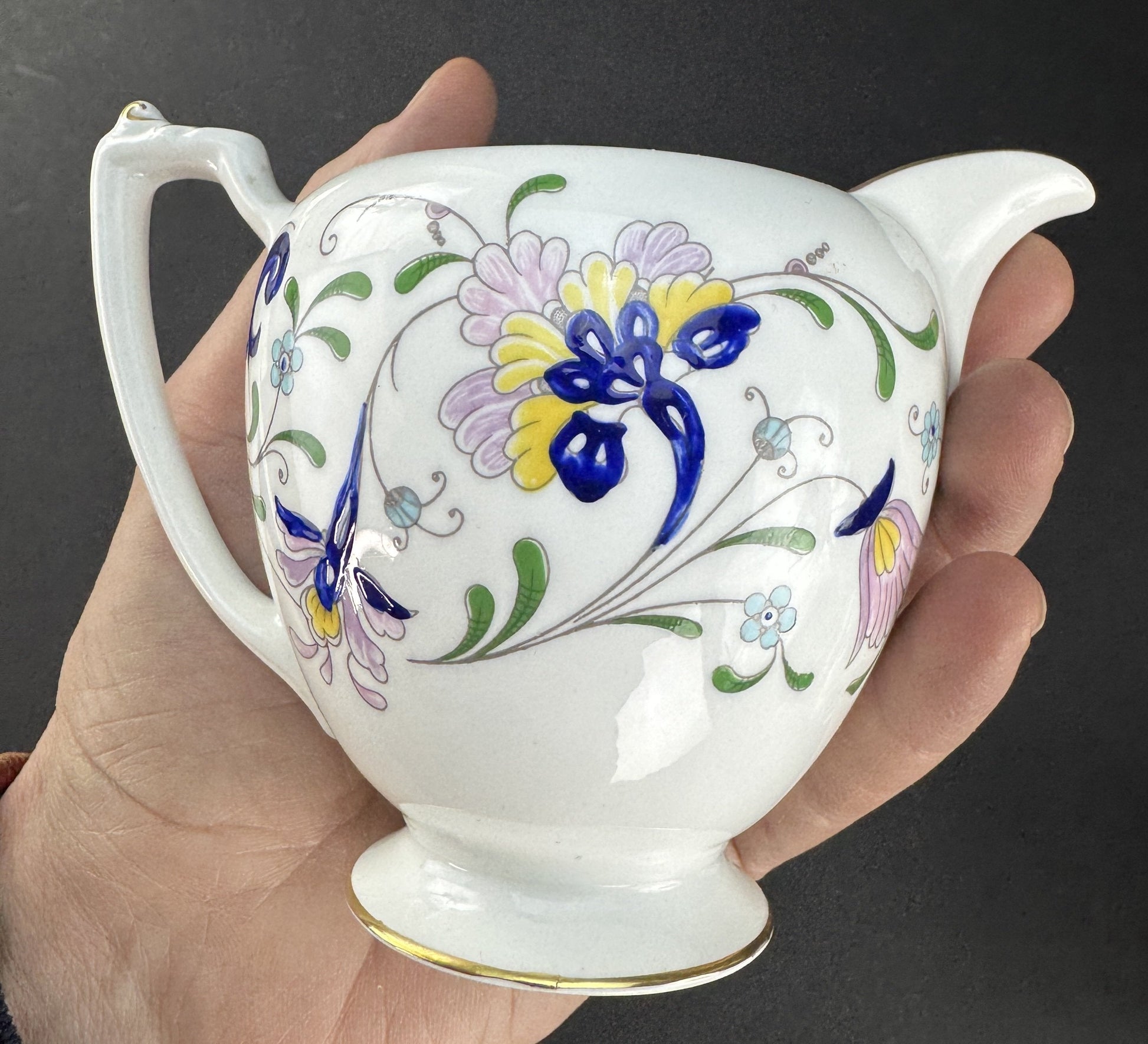 Presented is a fine quality porcelain sugar and creamer set in the Pageant pattern by Coalport. The sugar and creamer are very attractive with raised enamel painted decoration. This pair was probably made between 1940 to 1973.