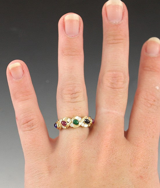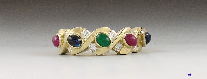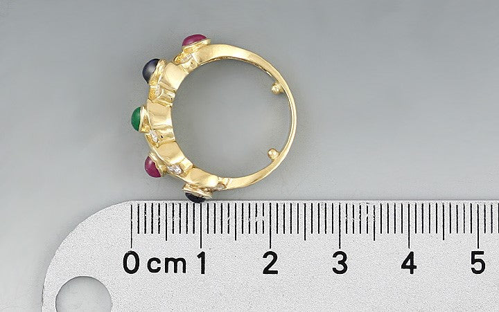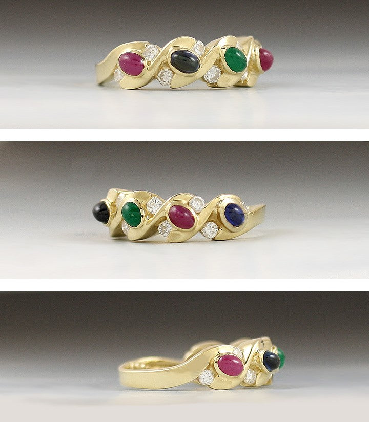 Presented is a modern, 14 karat yellow gold, gemstone and diamond ring. The top is set with 10 modern brilliant cut diamonds, at least 4 points each in size. The diamonds are H color and SI clarity. There is at least 40 points in total diamond weight. There are also gemstone cabochons set along the top, there is an emerald, two sapphires, and two rubies. The gemstones have a better look and are more translucent in person than the photos show. This ring is a size 5 1/4 and it can be resized, also the small gold balls on the inside of the band that were previously added to size the ring can be ground down/removed.