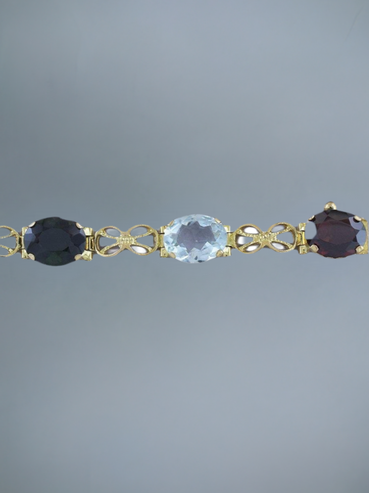 Presented is a fabulous 18 karat gold and gemstone bracelet. This is a relatively modern piece, likely made in Europe based on the 750 stamp, but we do not know more specifically where it was made. The bracelet is set with eight oval cut gemstones, interspersed with gold links in a knot type design. The stones, in order from the clasp end to the tongue end, are garnet, aquamarine, green tourmaline, citrine, amethyst, pink tourmaline, citrine, and amethyst. The stones each measure about 9.5-10 by 7-8 by 4-5 millimeters, LxWxH, with the specific measurements of each individual stone varying. The stones are all beautifully cut and faceted, catching the light very attractively. These are real, mined-from-the-ground stones, verified by our gemologist. The bracelet closes with a tongue insert style clasp, which has an additional safety latch on the side for extra security.