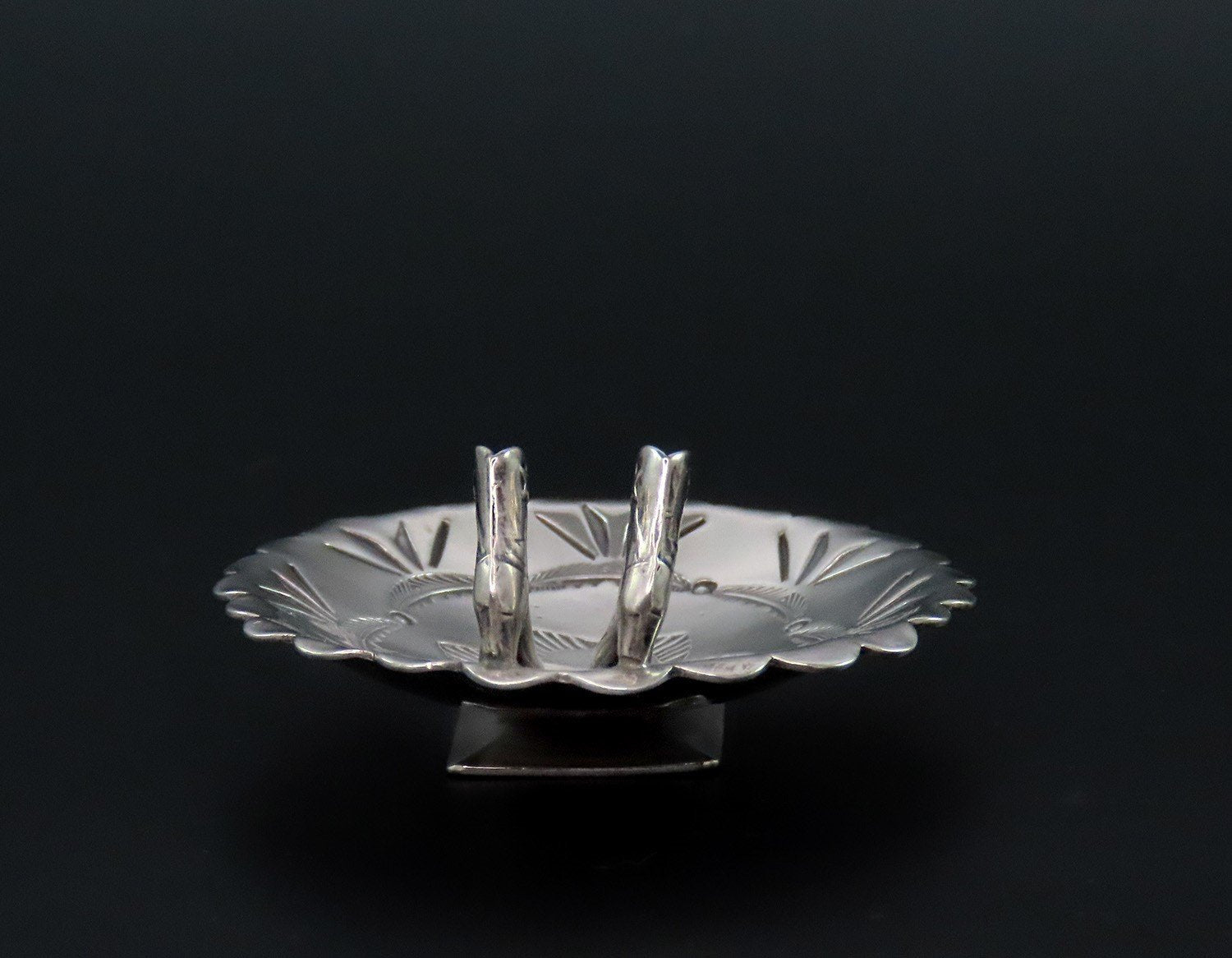 Presented is a cool small sterling silver oval ash tray in a western style from Vaughns. This piece displays great engraved star and feather decorations and a scalloped edge. The dish has great well-detailed cowboy boots on one side. A cigarette would rest between the boots. The dish itself appears to be formed from an Indian conch.