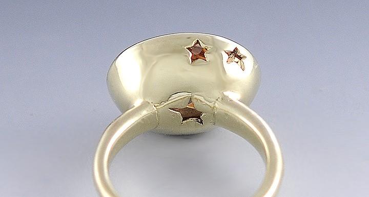 Presented is a lovely 14 karat yellow gold ring set with an interesting yellow stone. The stone is a synthetic stone, probably a cubic zirconia, yttrium aluminium garnet, or a gadolinium gallium garnet, in a rich yellow with nice clarity. The setting has lovely star shapes cut out in the sides, to better display the stone. The stone has a neat domed faceted style, very pretty and eye-catching. The setting is well done and quite sleek.