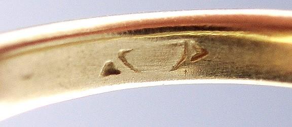 The band is stamped and guaranteed 14k and has a maker's mark we unfortunately do not recognize.