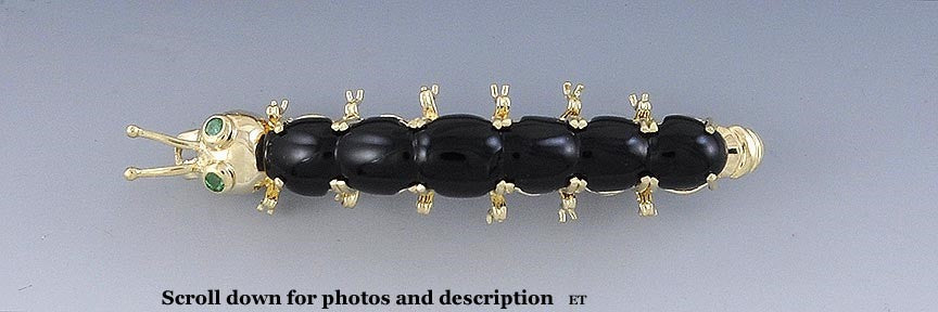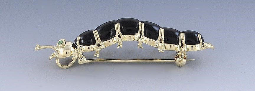 Cute Retro 14k Yellow Gold Onyx Emerald Caterpillar Pin Brooch