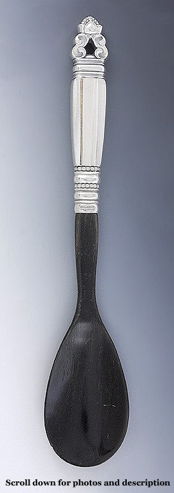 Presented is a great Georg Jensen sterling silver handled serving spoon. This piece is done in the stylish Acorn pattern, which began production in 1915. The handle of the spoon is sterling silver, while the bowl is made from smooth dark horn. Use this spoon to serve salad or anything else you like. Since the bowl is made from horn, there isn't any need to worry about tarnish or corrosion from salt, vinegar, etc.