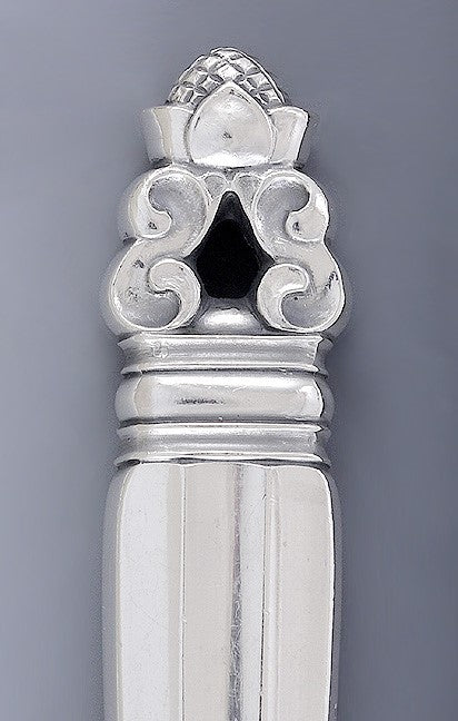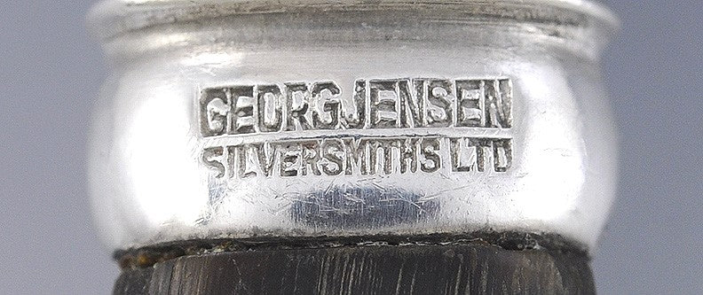 One side of the handle is stamped with the maker's mark for Georg Jensen, while the other side is marked sterling and Denmark.