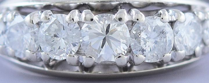 about 1 carat. The diamonds are vibrant, sparkling stones of I-1 clarity and H