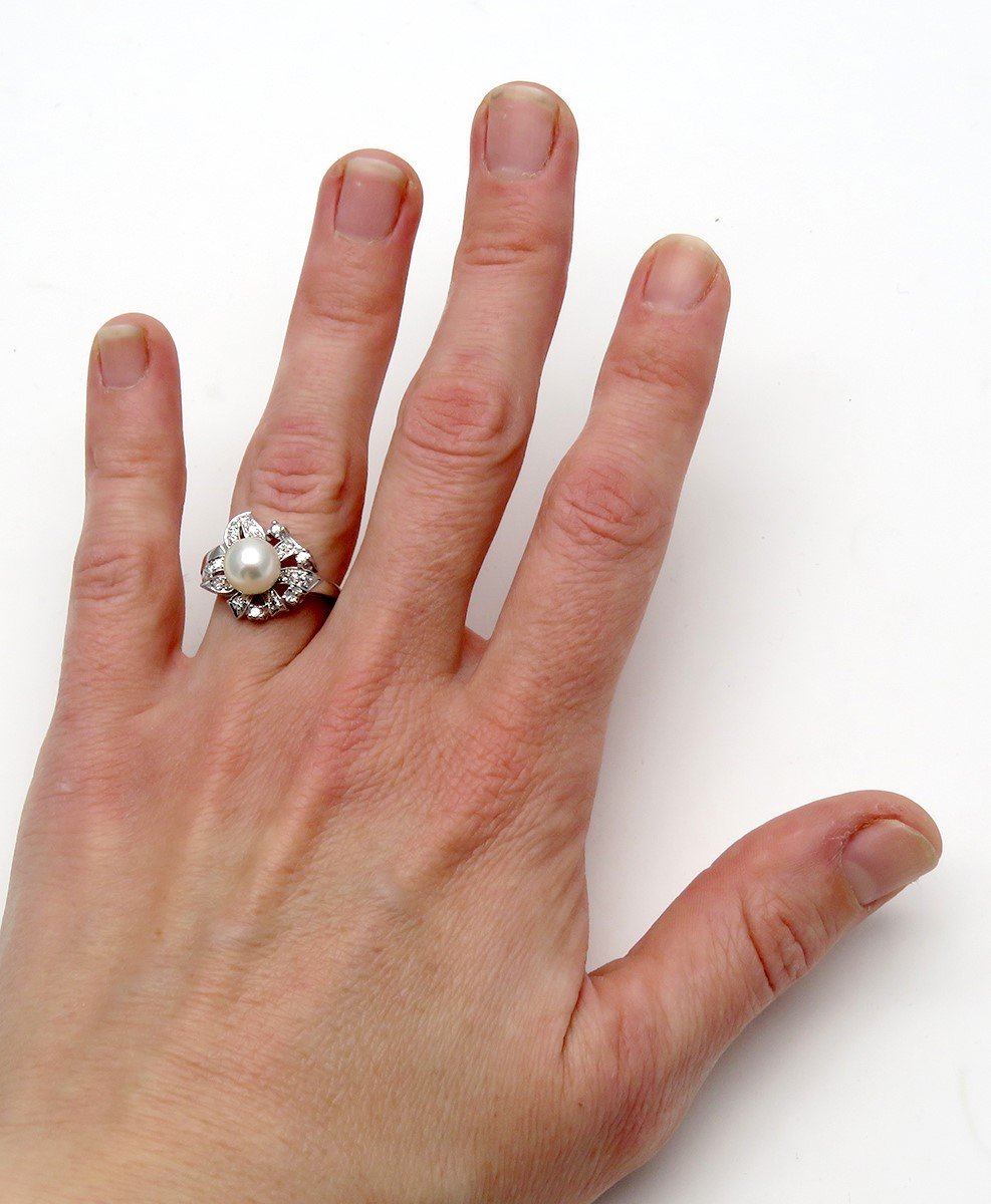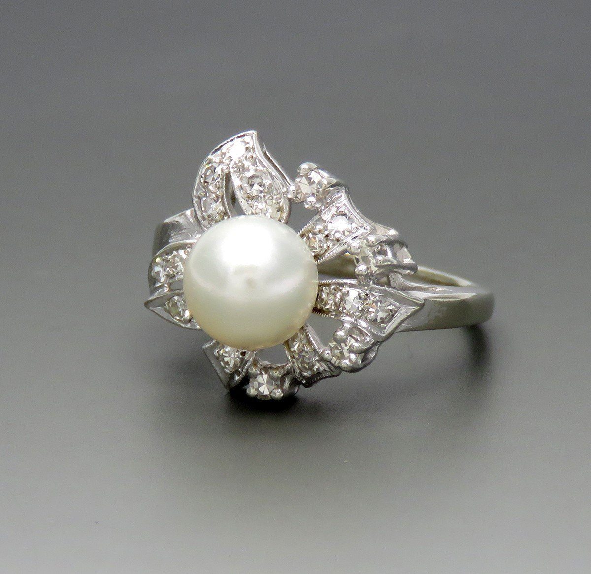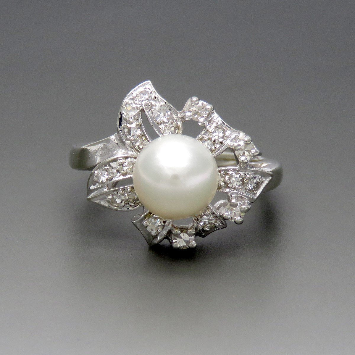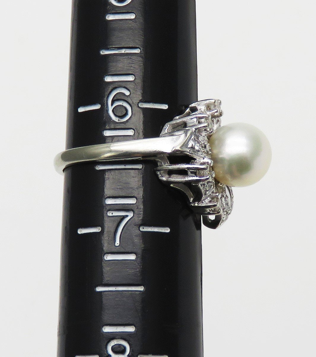Presented is a lovely vintage 14 karat white gold, pearl and diamond ring. The ring is set with a gorgeous pearl measuring about 7.9 millimeters in diameter, surrounded by a stylized bowtied ribbon design set with diamonds. There are 22 diamonds, all dazzling single cut stones, of VS-SI clarity and nice white color. The total diamond weight is at least 22 points, maybe a quarter carat (.25ct) total. The diamonds have a lot of life and sparkle to them, especially in the crisp white gold setting with its milgrain finish.