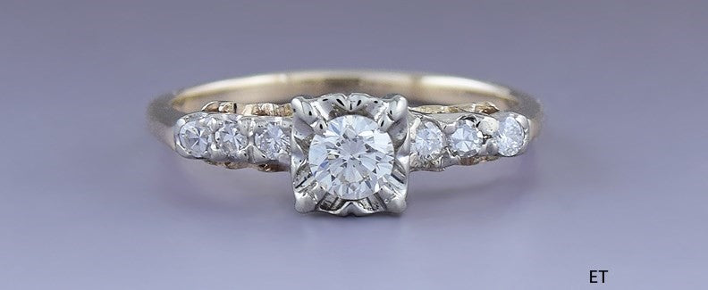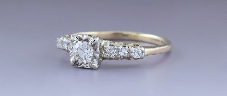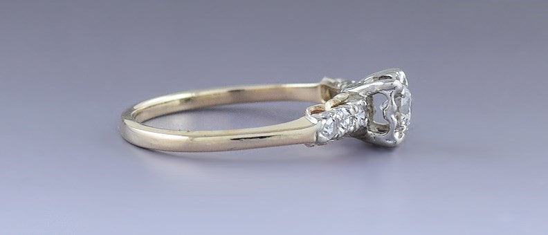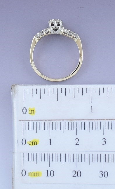 Presented is a beautiful 14 karat gold and diamond ring. The ring is set with 7 total diamonds, one larger in the center flanked by three smaller on either side. The center diamond is a modern brilliant cut stone of about 22 points in size, of VS-1 clarity and G/H color. The accent diamonds on either side are vibrant, dazzling stones with a lot of life and fire, totaling another 15 points in weight. The total diamond weight for the ring is about 38 points, or just over a third of a carat. The band is done in 14 karat yellow gold, with the diamonds set in 14 karat white gold so they really pop.