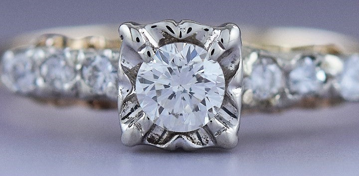 The ring is in great overall condition. There are a couple of minor chips to the smaller diamonds, but these are hard to notice without careful inspection using jeweler's magnification and strong lighting. The gold band has no breaks and no repairs.