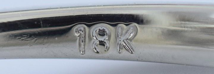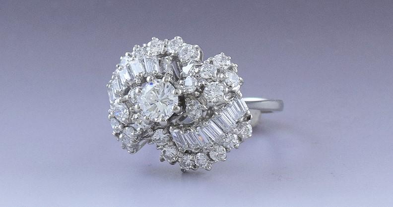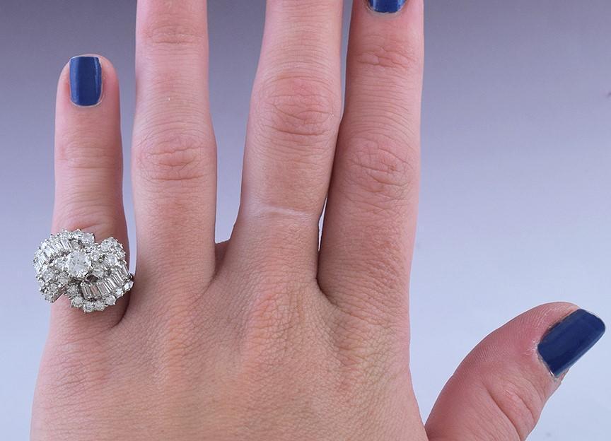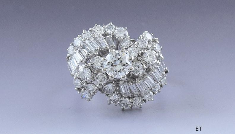 Presented is a gorgeous 18 karat white gold and diamond ring. This is a modern piece, made in Italy. The central stone of the ring is a beautiful diamond of about 56 points in size, certainly at least half a carat. This diamond is eye-clean, of SI-1 clarity and H/I color. Surrounding that diamond are 26 modern brilliant cut diamonds averaging 4-5 points each in size, and 14 baguette diamonds averaging 3.5 points each in size. The round cut diamonds are all SI-1 or better clarity and H/I color, while the baguettes are all VS-1 or better and H/I color. The total diamond weight is about 2.09 to 2.35 carats. The ring is in great condition. The diamonds are all intact and well set, with no chips. There are no breaks and no repairs. The band is stamped 18k as well as Italy. There is also a stamp of 56, which we believe refers to the size of the diamond in the center, about 56 points. The ring is a size 6. The ring weighs 7.6 grams.