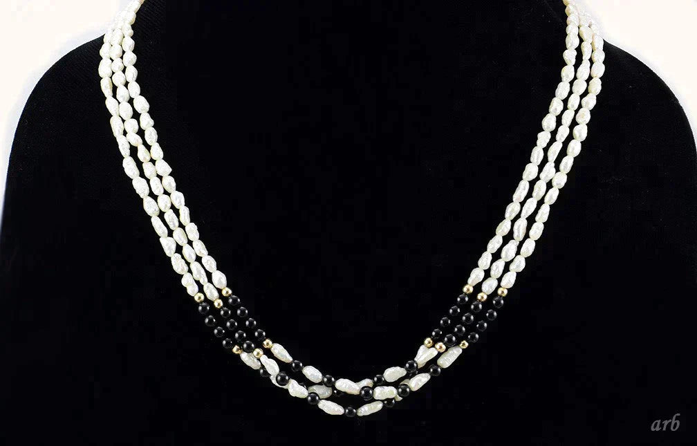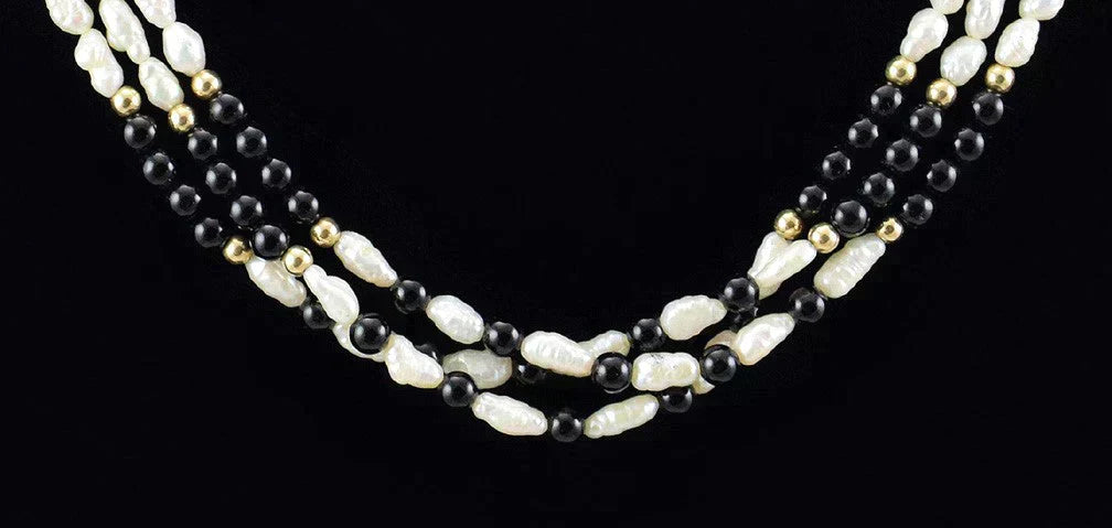 Dazzling Freshwater Pearl Necklace w/ 14k Gold and Black Round Beads