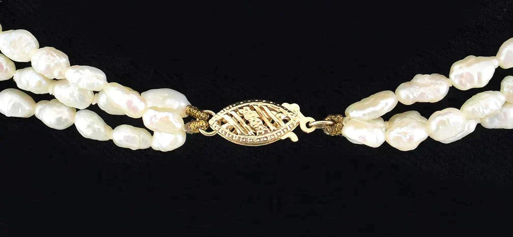 Presented is a dazzling necklace of 3 strands of white freshwater pearls, gold and black beads, and a yellow gold filigree clasp.