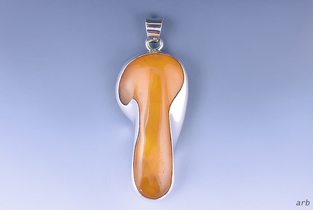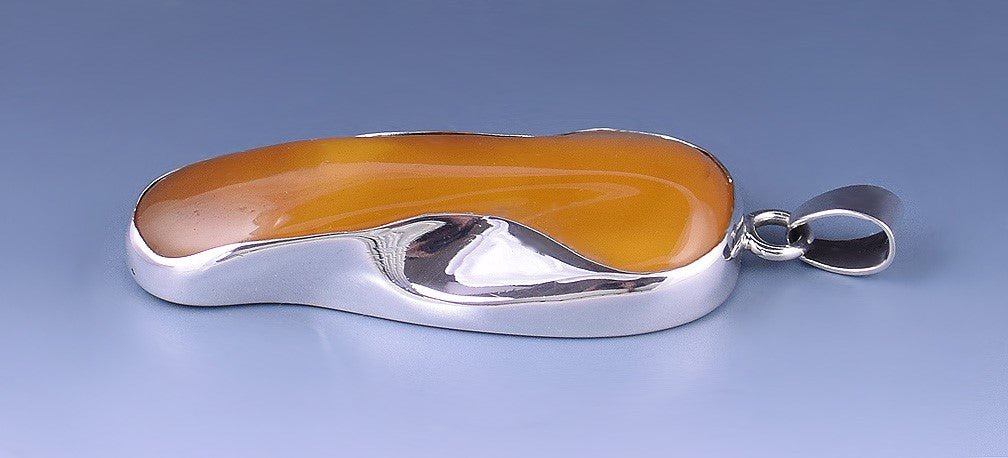 Presented is a large Polish amber pendant. The amber is yellowish brown. It is beautifully bezel set in high polished sterling silver. This setting follows the natural curves of the stone giving the pendant a unique shape. Please see the photographs below!