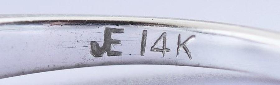 The band is stamped and guaranteed 14k and has a maker's mark of JE.