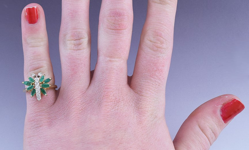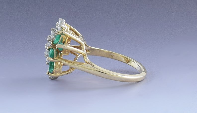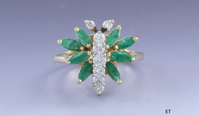 It features a gold setting filled with 8 real diamonds and 8 marquise-cut genuine emeralds.