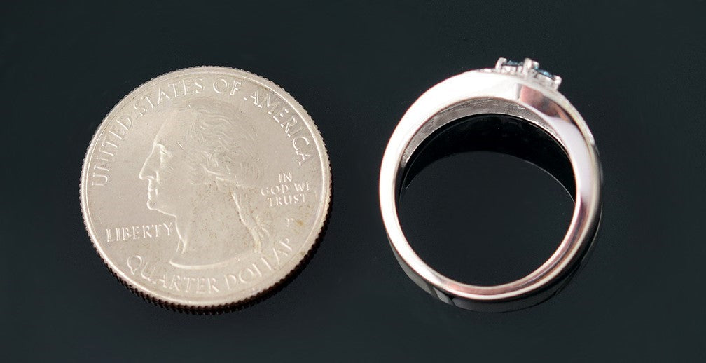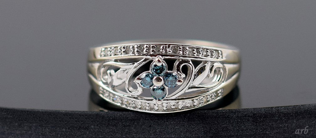 Delightful Modern 14k White Gold, Diamond and Blue Diamond Ring Size 7