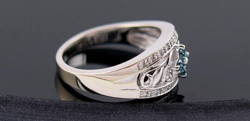 They derive their color from irradiation. How gorgeous they are! The diamonds set into the top and bottom of the ring are white diamonds.There are 18 diamonds in total. The blue diamonds are about 3 points each, thus, about 12 points in total. The white diamonds are about 1 point each, thus, 18 points in total. There are 30 points in total diamond weight here. 30 points is equal to 0.3 carats, or about a third of a carat.