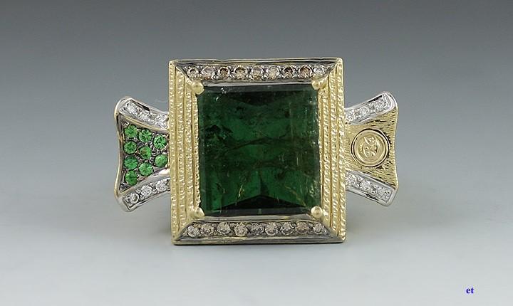 Designer 18k Gold Tourmaline White & Yellow Diamond Demantoid Garnet Ring
