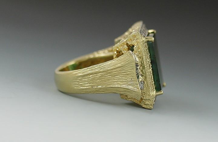 garnets on the sides. The gold of the setting is nicely textured, with openwork